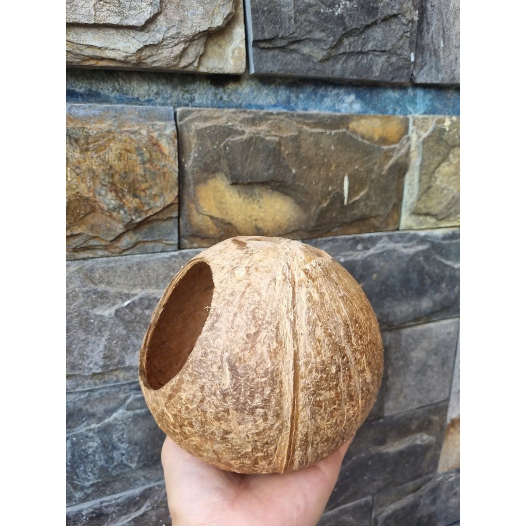 Coconut shell drilled into a round mouth, sharpened to clean fibers. Used to make sleeping nests, nests for birds, squirrels, mice... used to decorate as you like