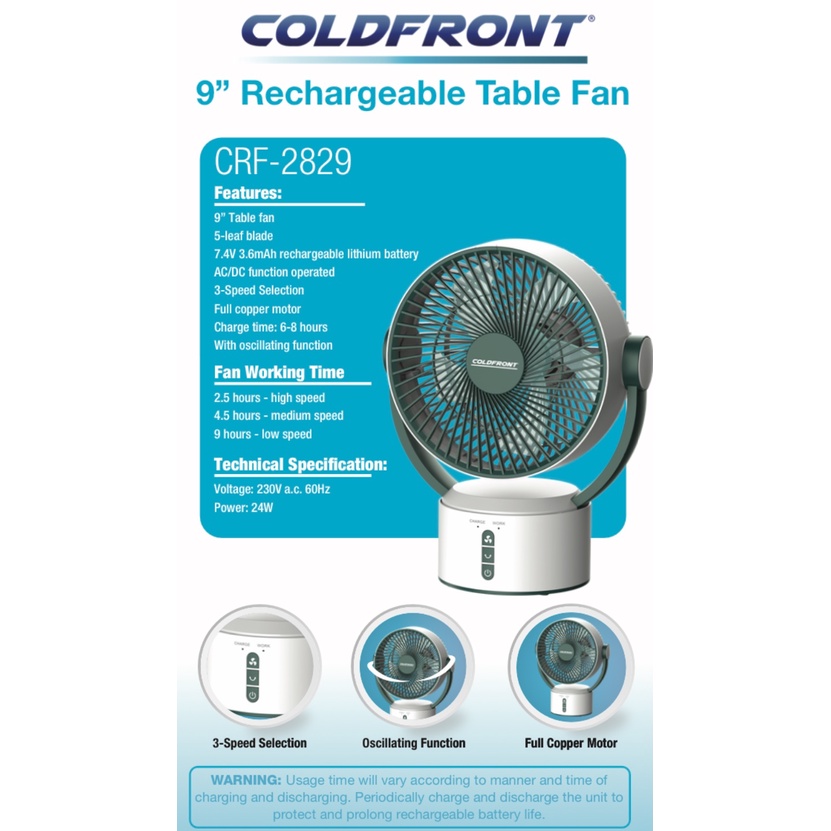Coldfront by Tough Mama CRF-2829 Desk Fan Heavy Duty Rechargeable Fan