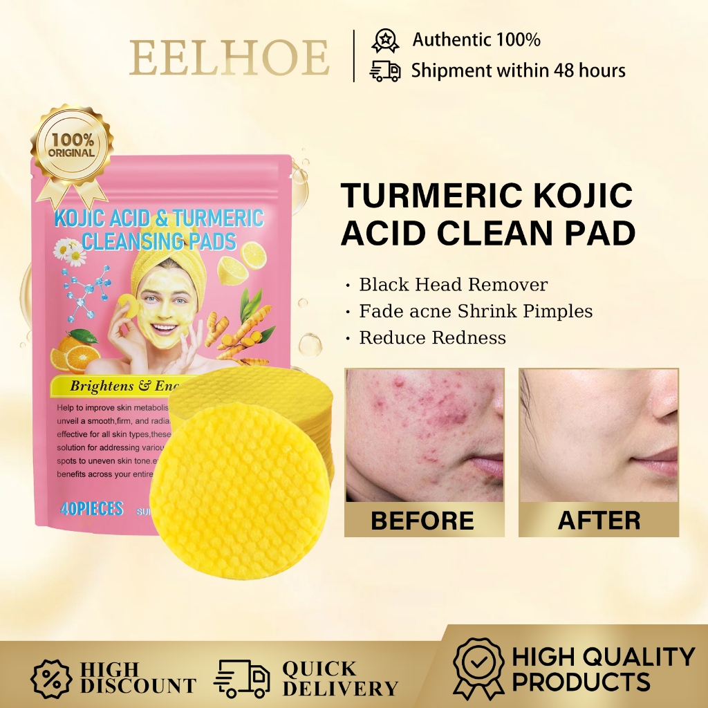 EELHOE Turmeric Kojic Acid Facial Cleansing Pads 40pcs Black Head Remover Fade acne Shrink Pimples Reduce Redness Mild cleaning Deep Cleansing Exfoliating Pads