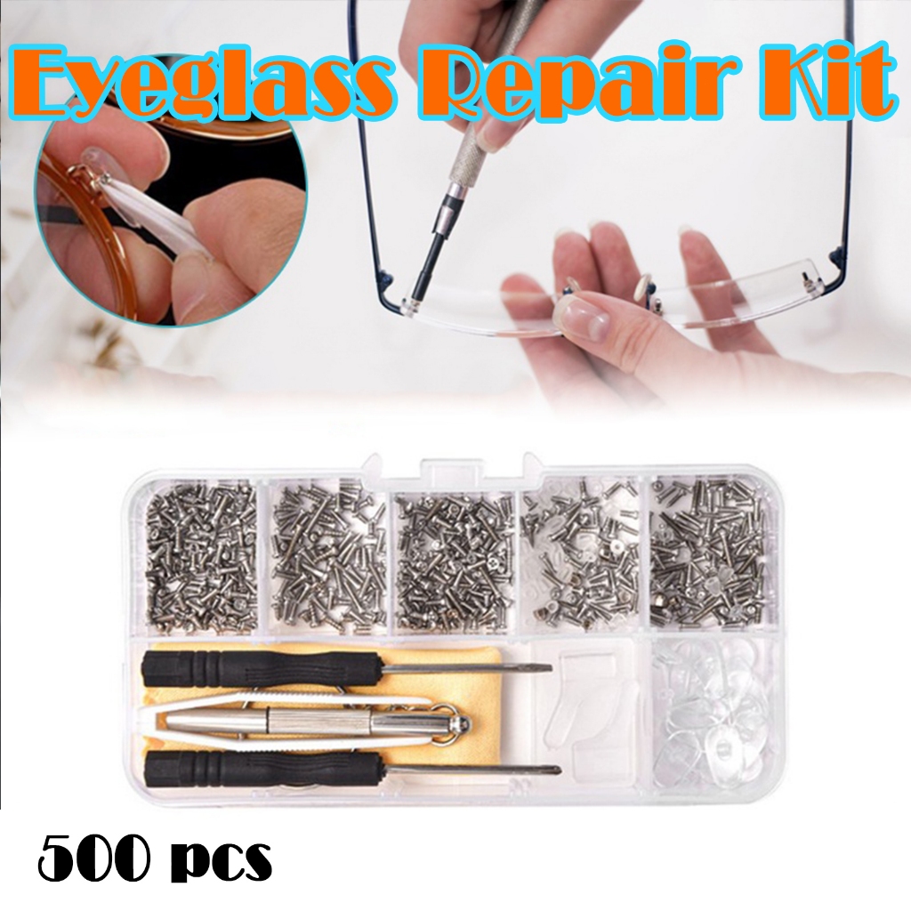 Comprehensive Eyeglass Repair Kit 500 Screws, 10 Nose Pads, Tweezers, and Screwdriver for Glasses