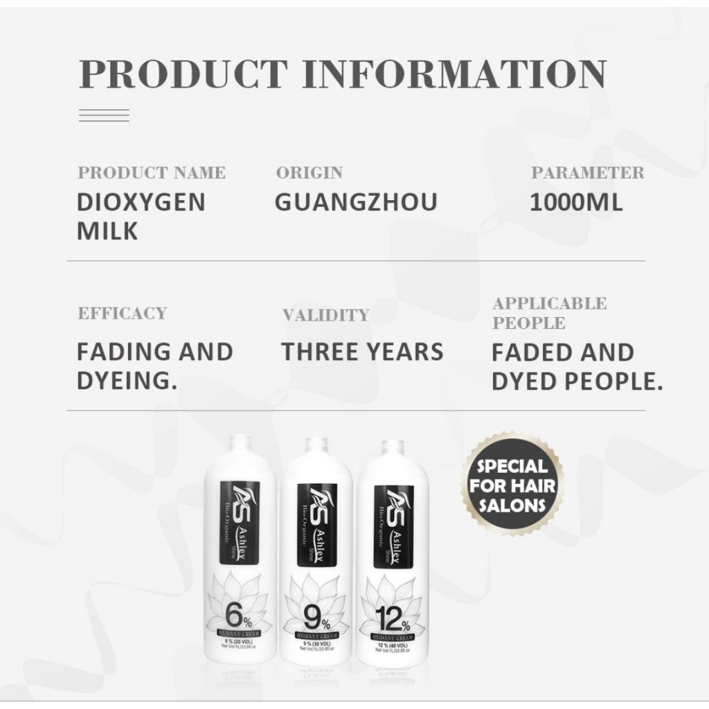 Preferred Ashley Shine Oxidizing Cream 1000ml Oxidizer6%9%12%Oxidant for Hair Color Dye Bio-Organic