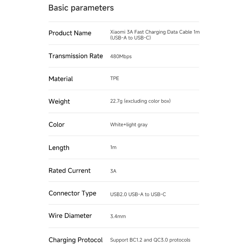 Xiaomi 3A USB-A to USB-C Cable (1m) 33W Super Fast Charge Type-C Cable Quick Charge USB Cable