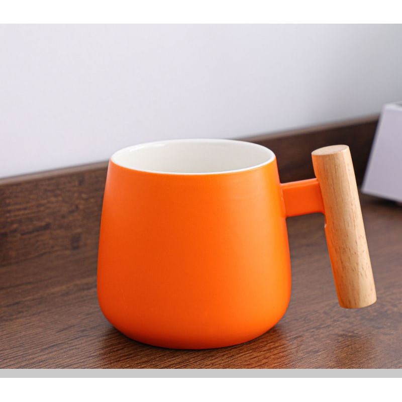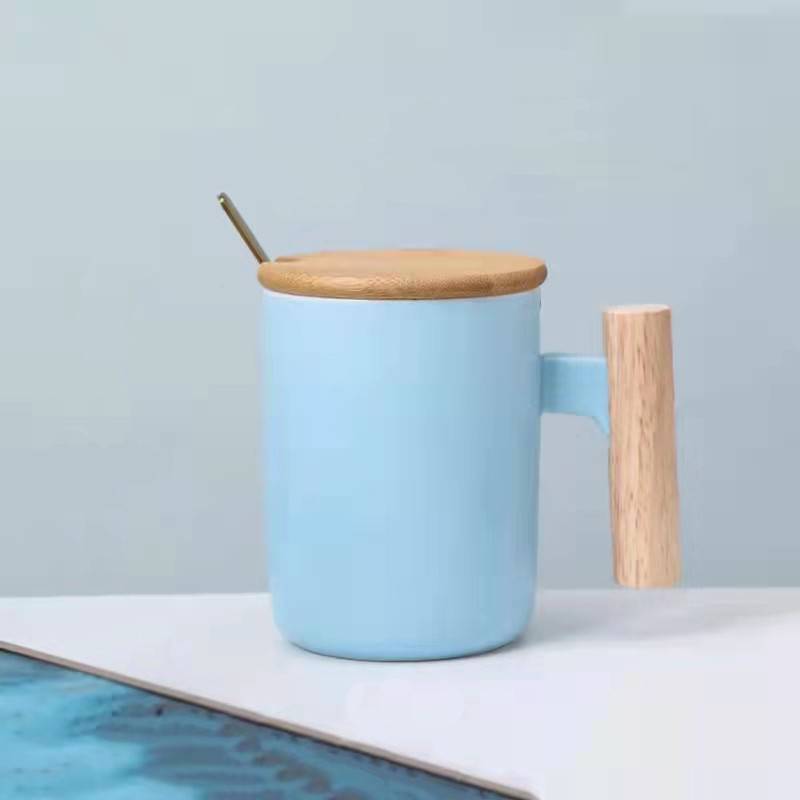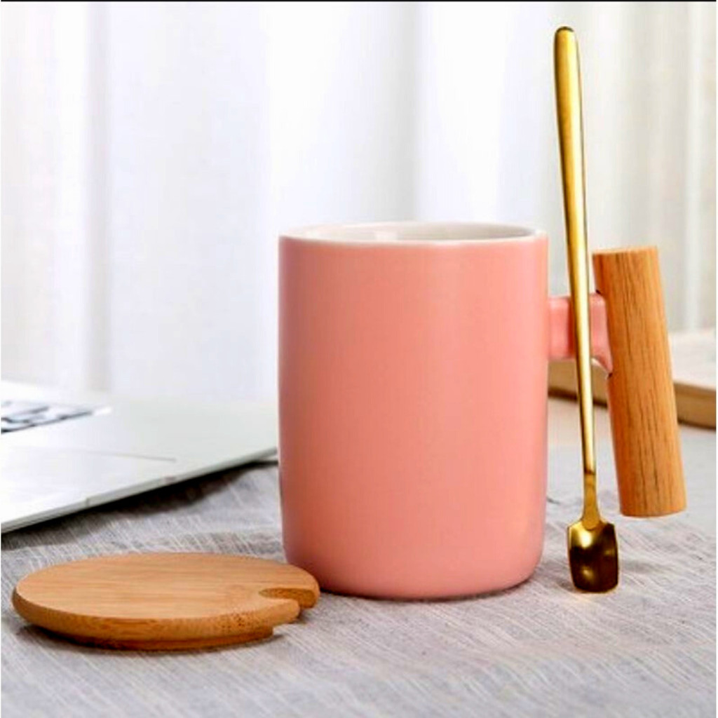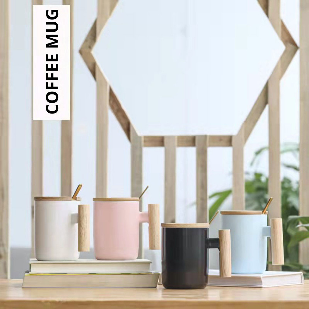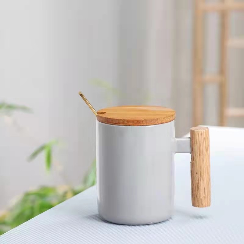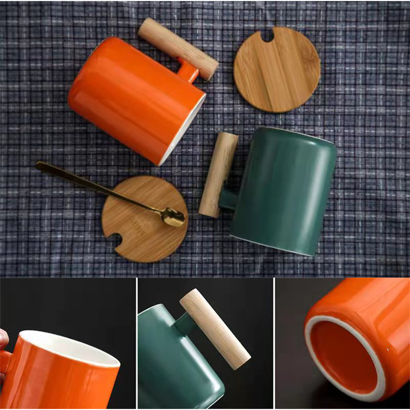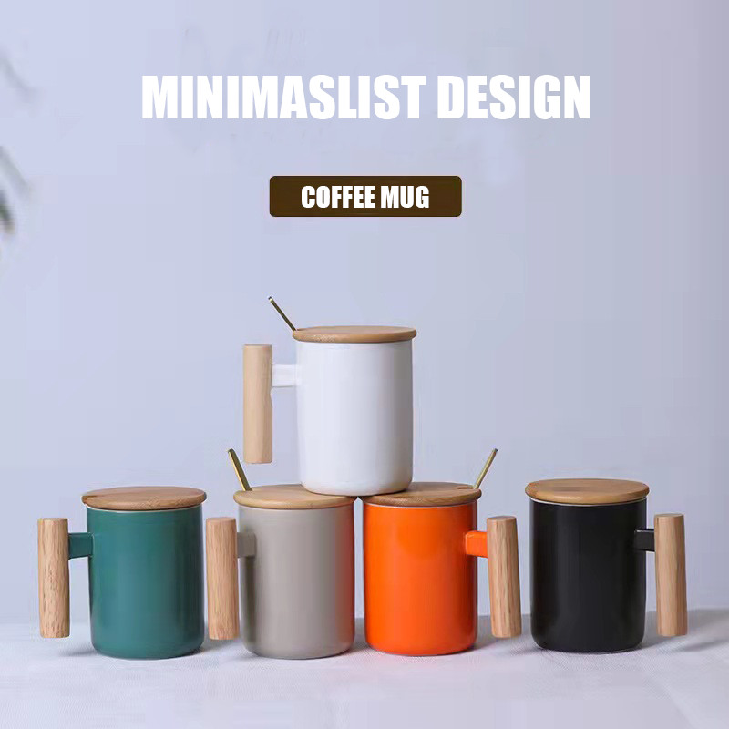 350 ml Nordic Minimalist Handmade Ceramic Mug Coffee Tea Cup with Wooden Handle and Water Cover Lid