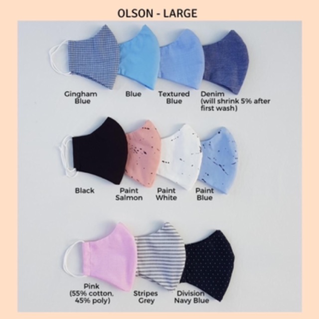 Cotton Washable Face Mask Olson Style - Standard, Large and Kids sizes available