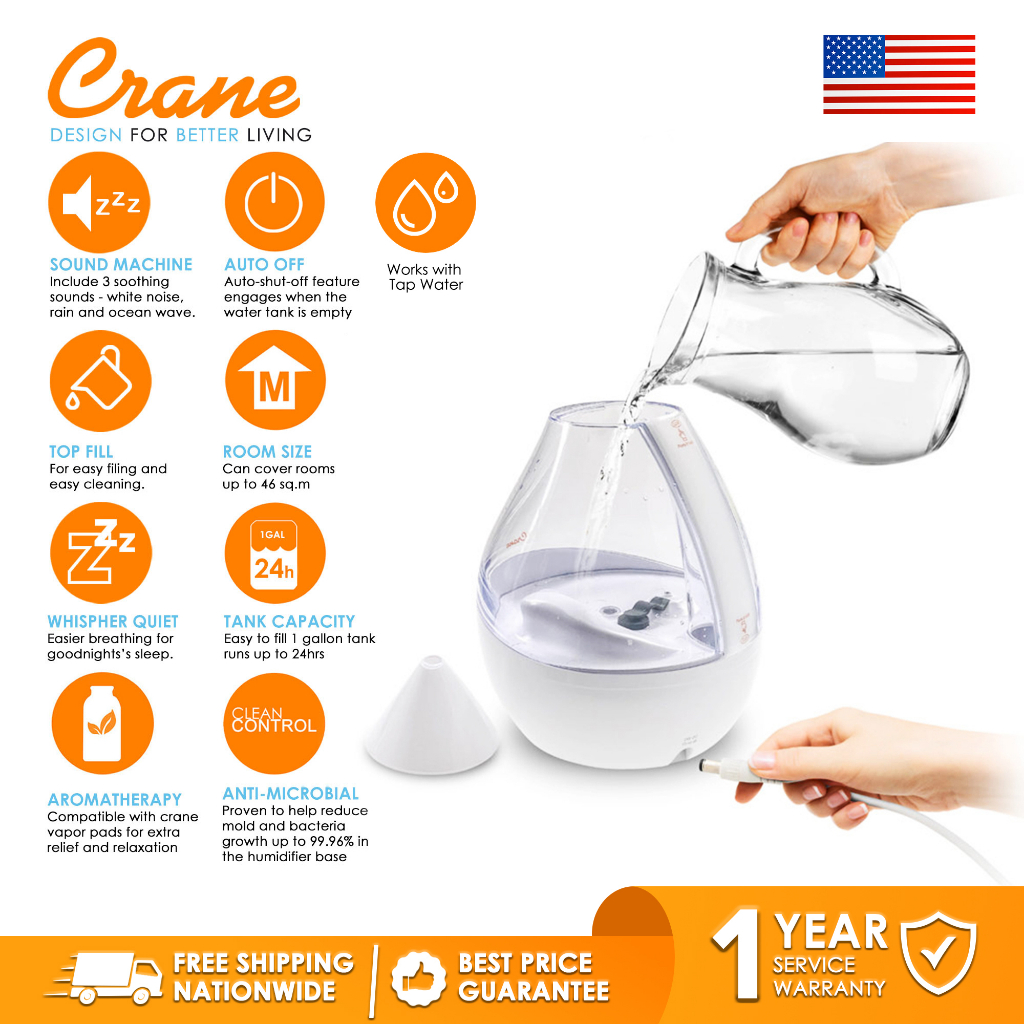 Crane 4in1 FilterFree Top Fill Humidifier w/ Sound Machine for Cough,Colds,Allergy,Sinus,Sore Throat