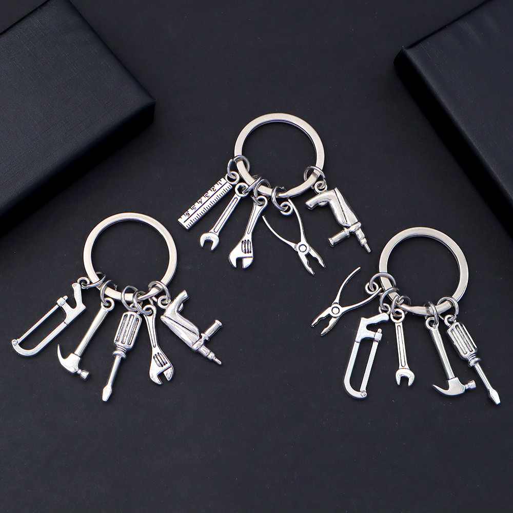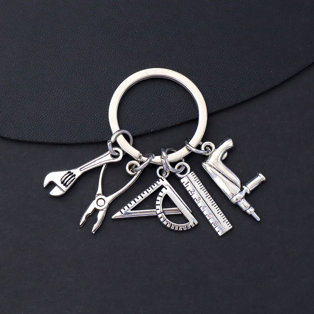 Creative Tool Shape Metal Key Ring Simple Silver Color Wrench Ruler Saw Pendants Keychains Men Bag Ornaments Gifts