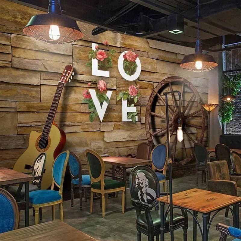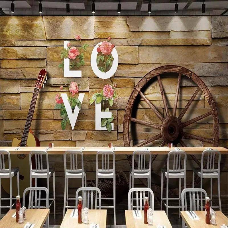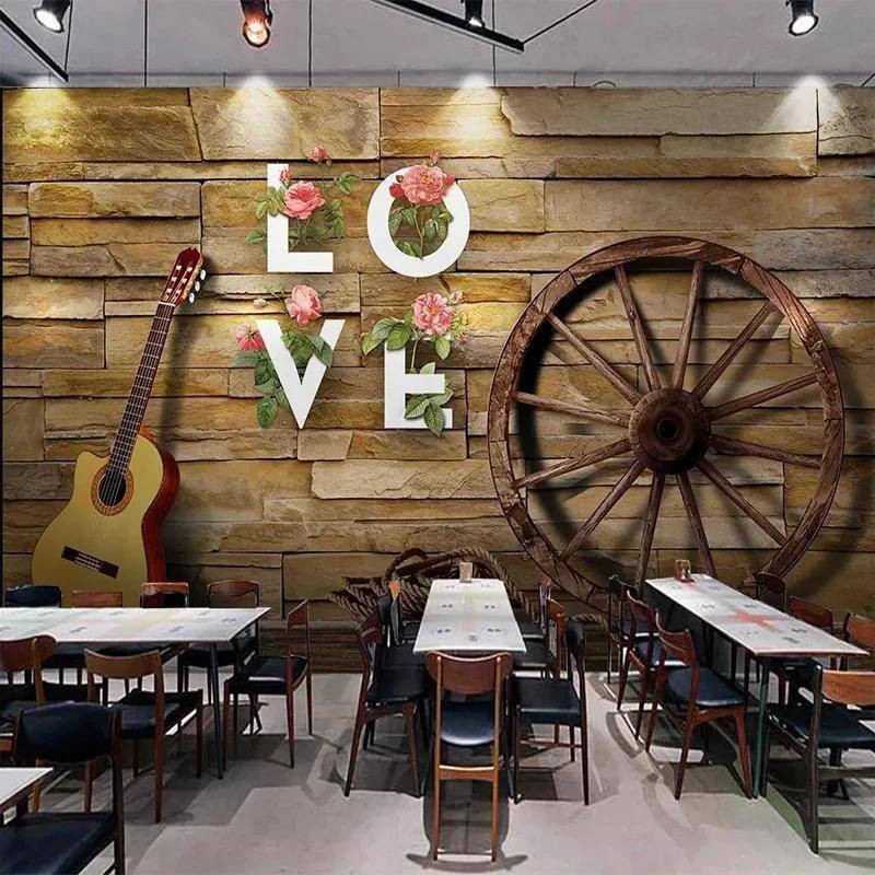 Custom Nostalgic Retro Wheel Guitar Brick Wall Background 3d Photo Wallpapers for Cafe Bar Restaurant Wall Mural Wall Paper