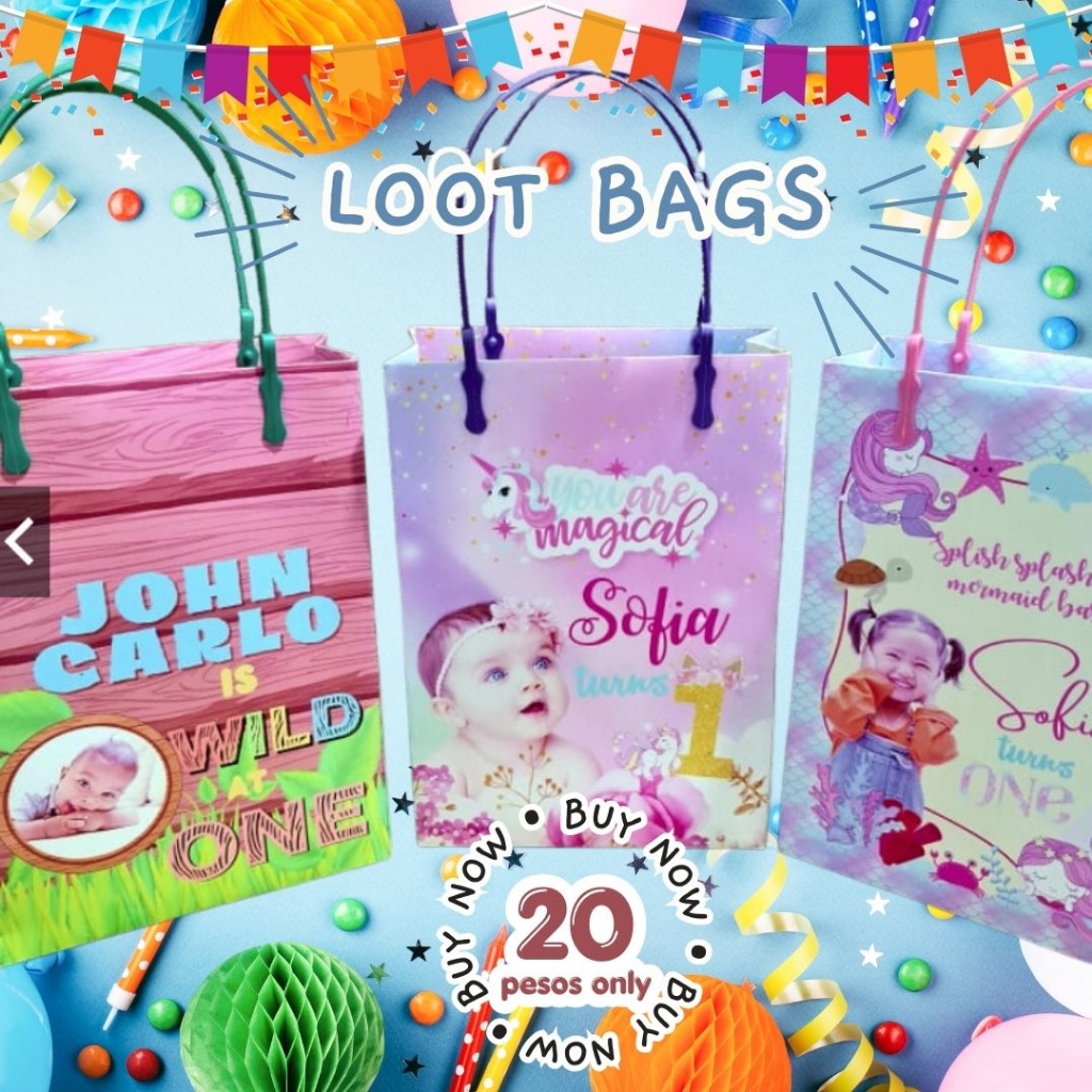 Customized / Personalized Paper loot bags, Chip bags, Party hats, Gable box, Banners