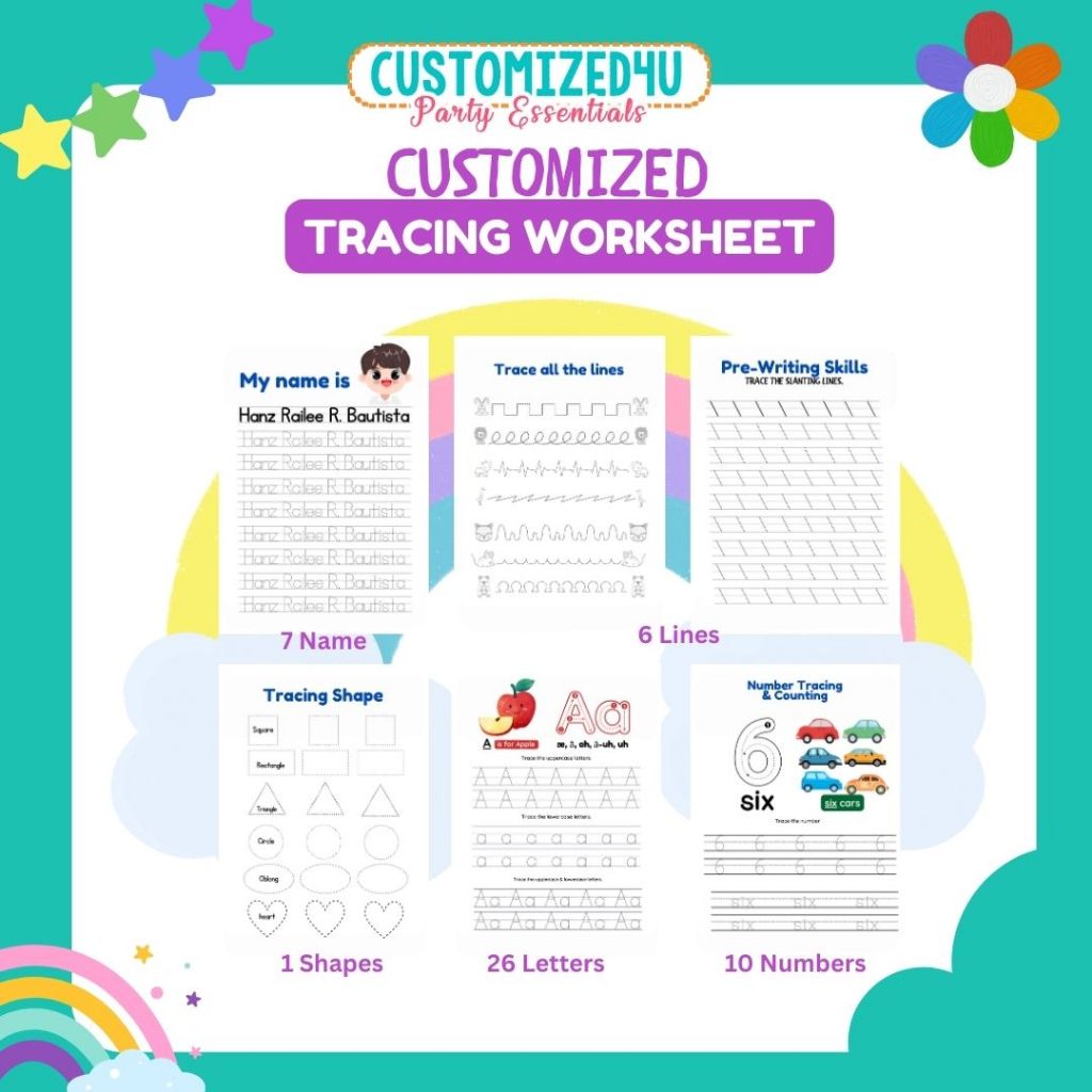 Customized Personalized Tracing Worksheets for Kids Alphabet Numbers Line Shapes Name