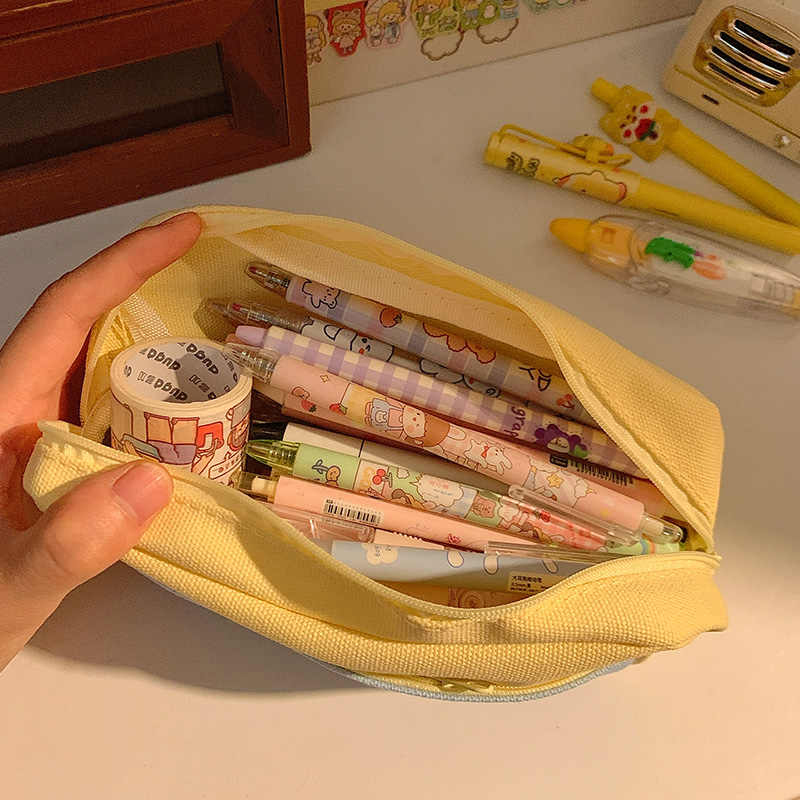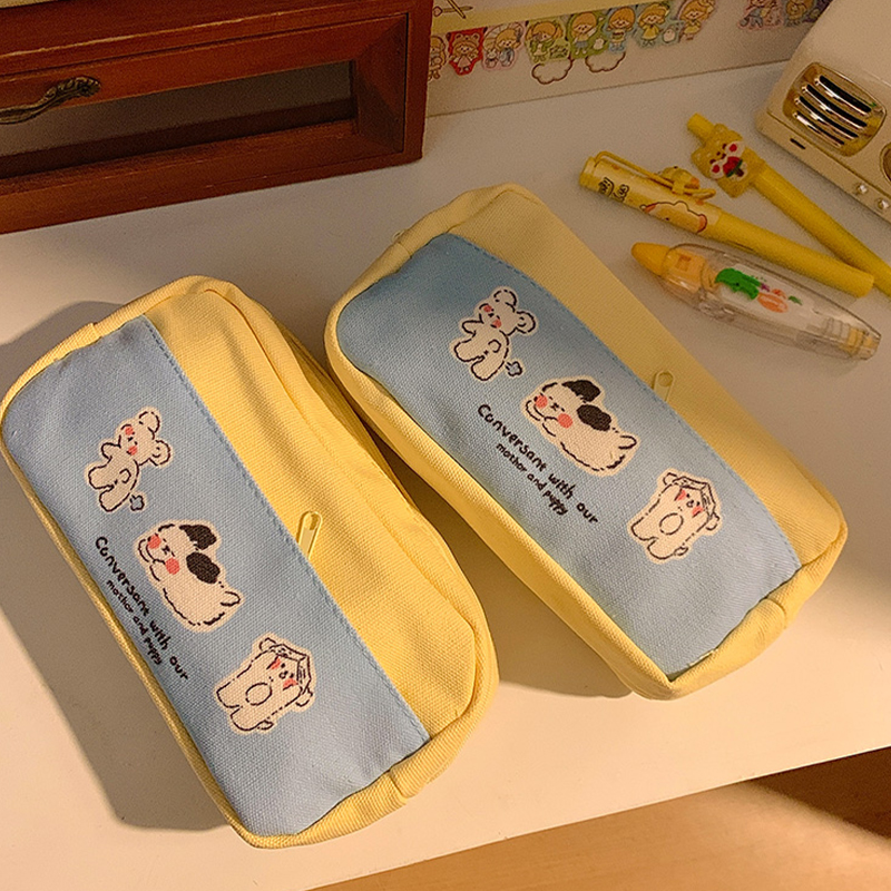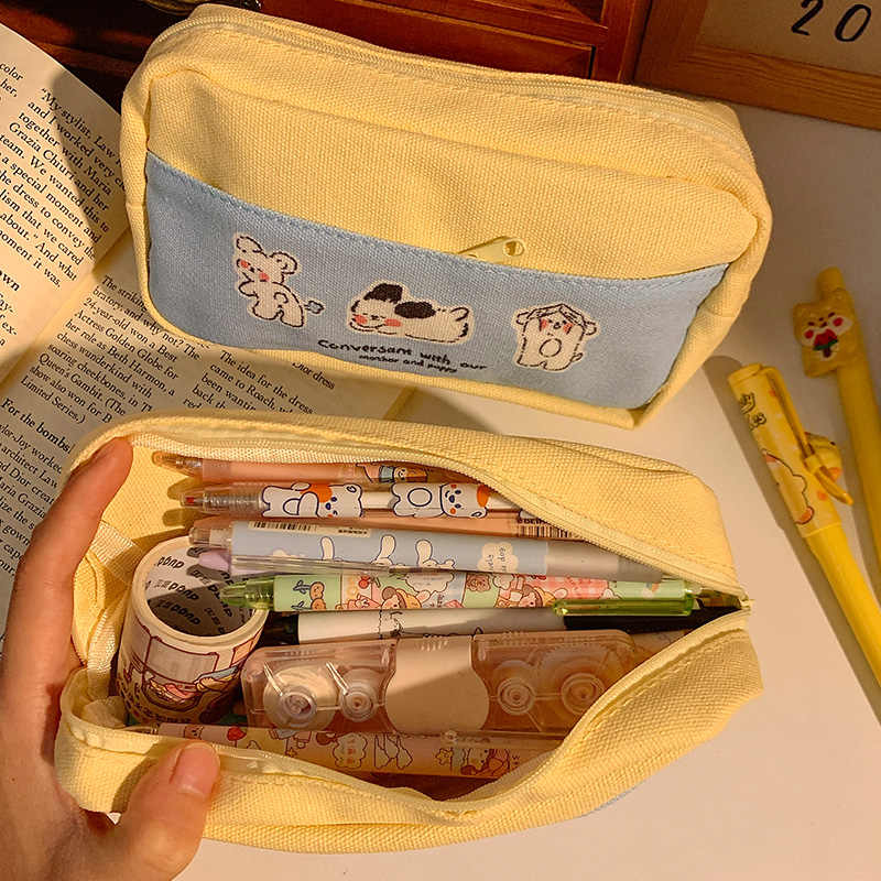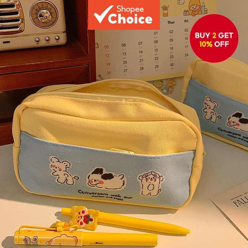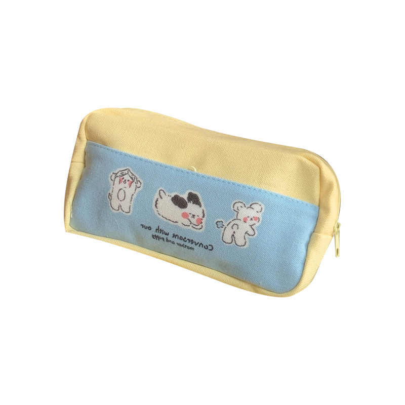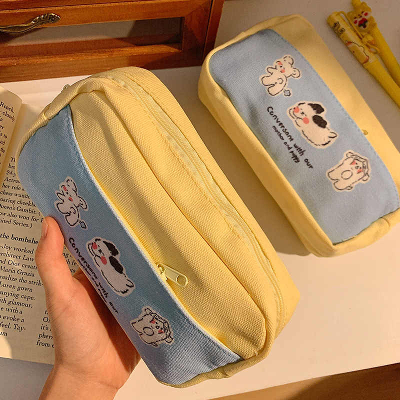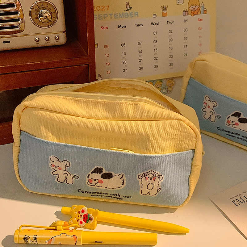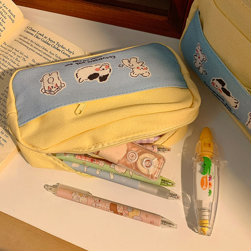 Cute Puppy Print Pencil Case Large Capacity Waterproof Canvas Pencil Bag Layered Double Zipper Stationery Storage Supplies
