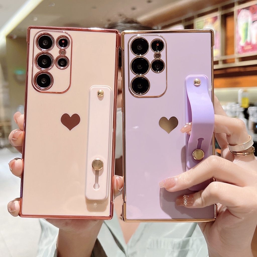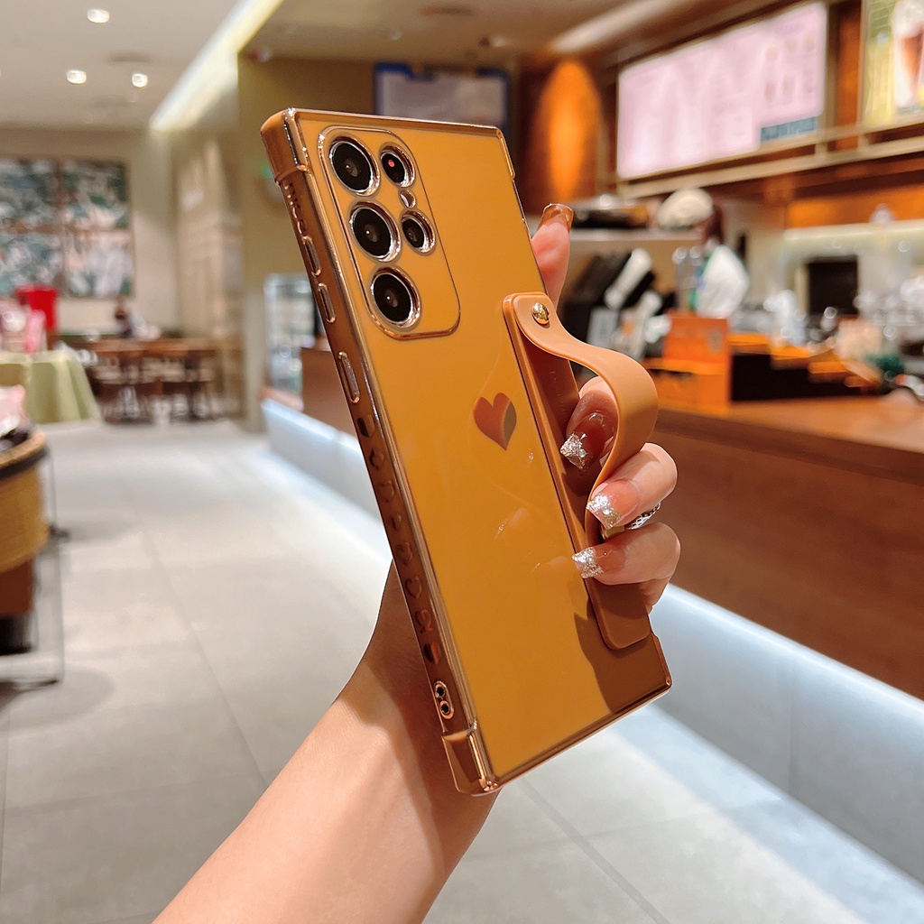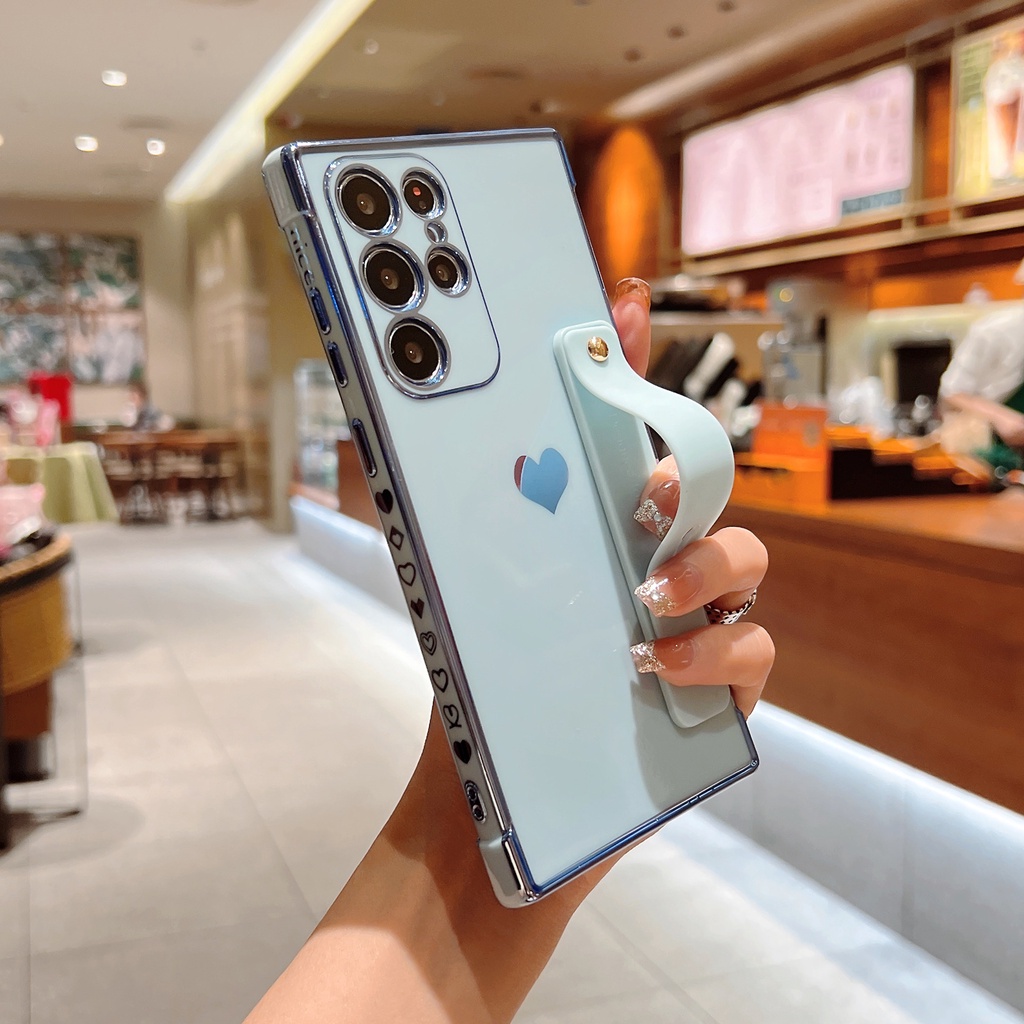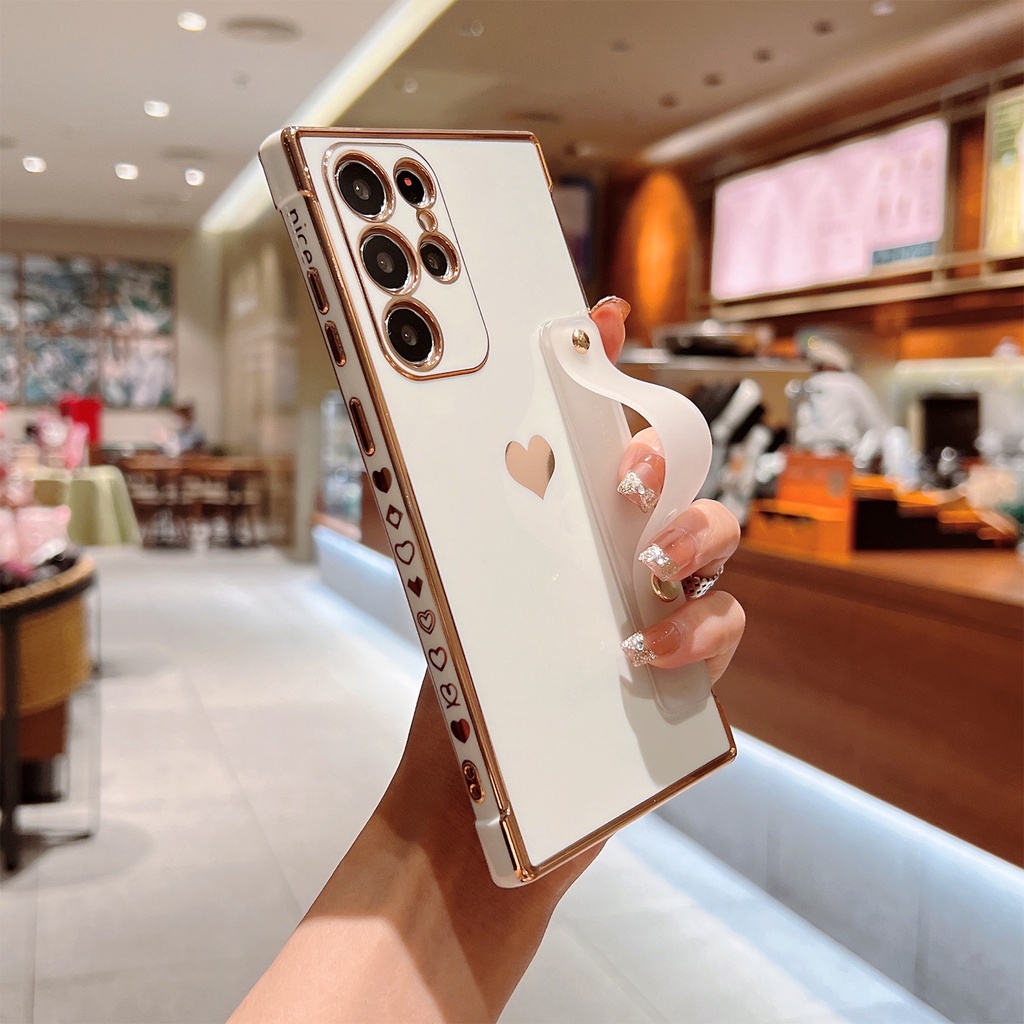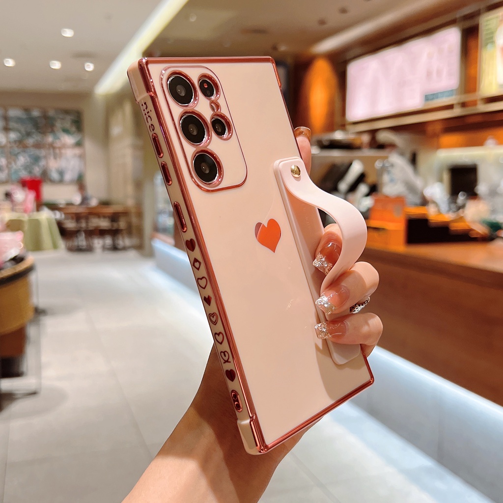 Cute Side Love Hearts Square Case For Samsung Galaxy A53 A13 A52 A12 5G S21 S22 Ultra Plus S21FE S20FE Wrist Strap Soft Cover