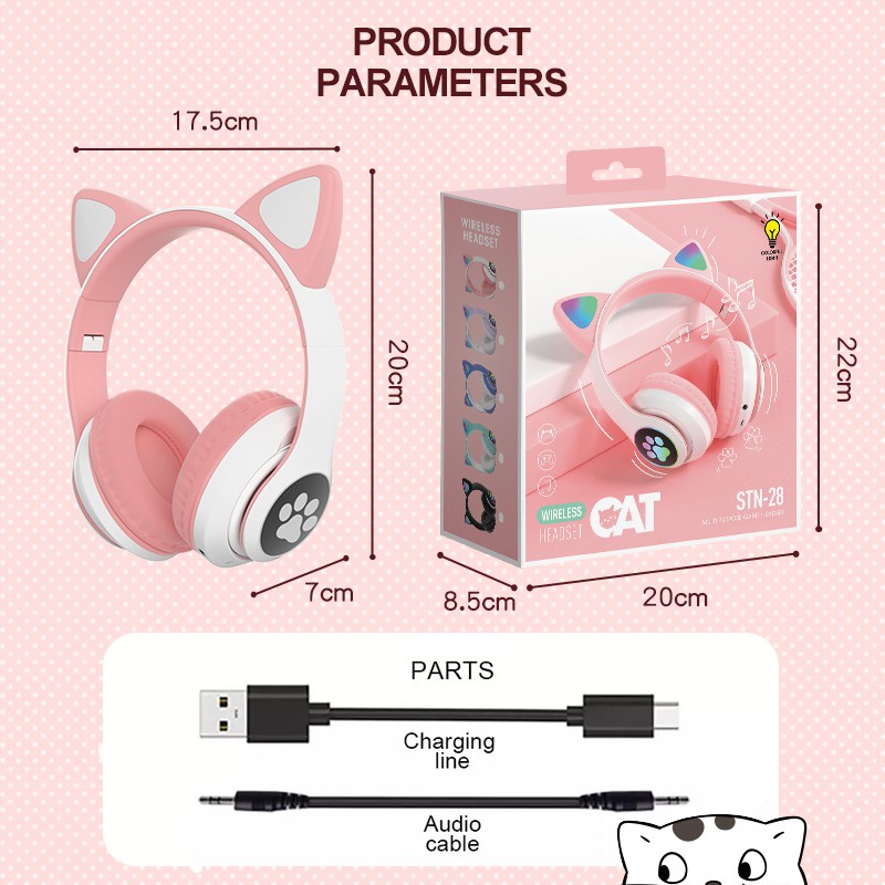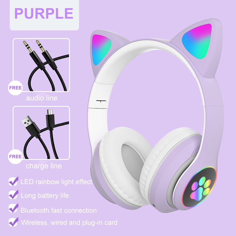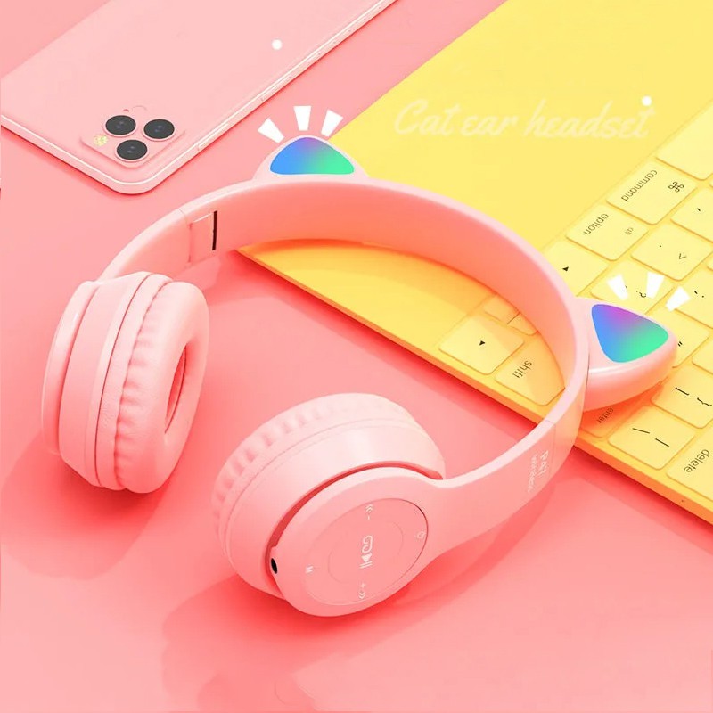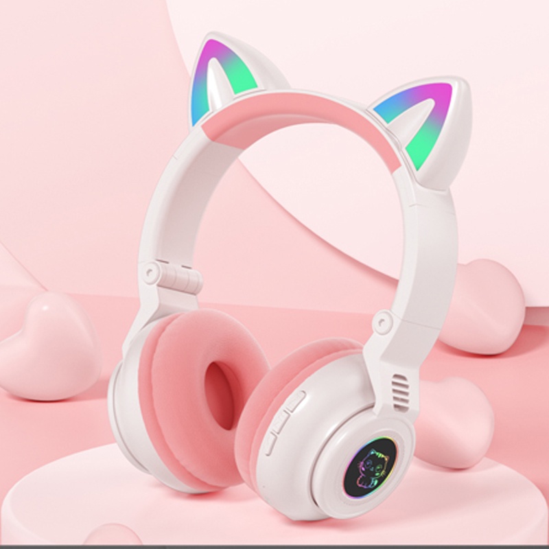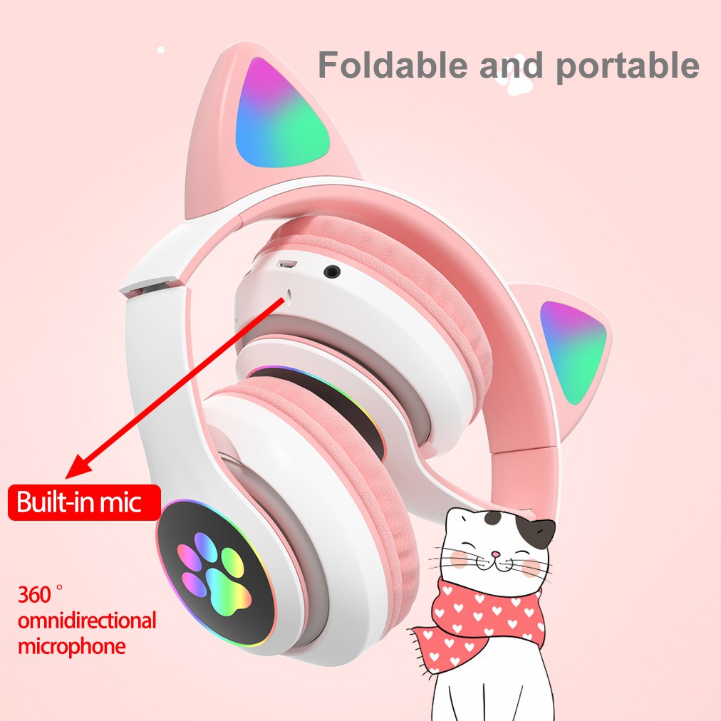Cute cat ears Gaming Headset Bluetooth 5.0 Pink stereo Wireless headphone with mic microphone LED light Earphone for Cellphone girls kids computer pc phone purple hearphone hello kitty 耳机