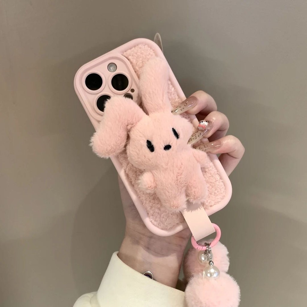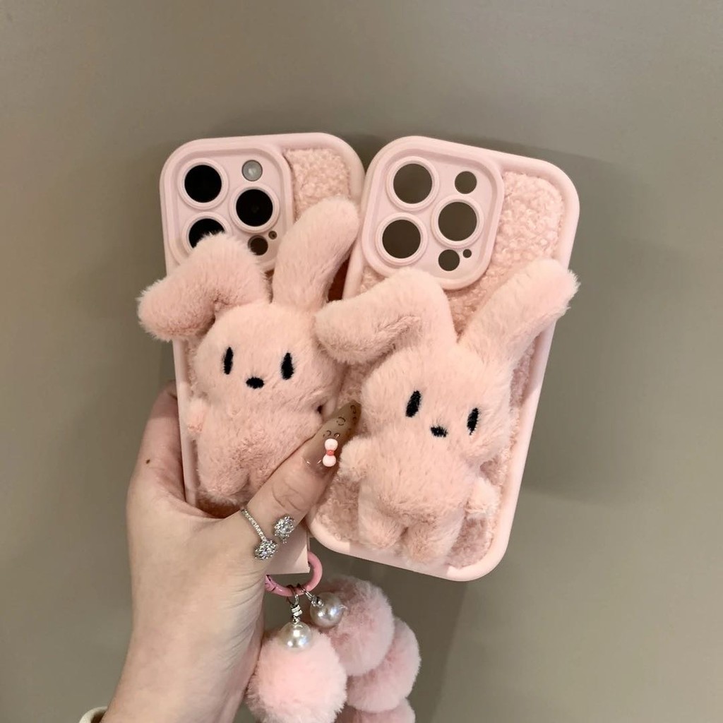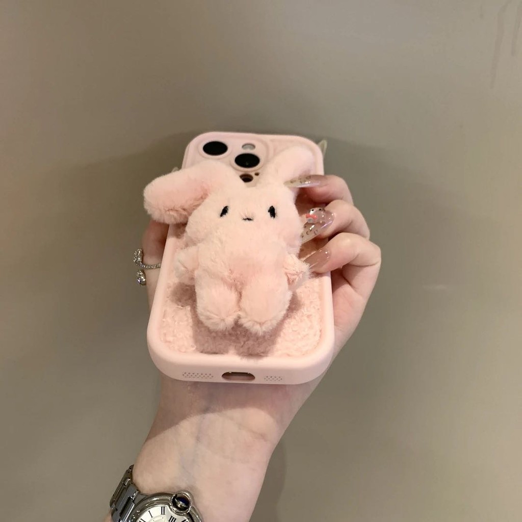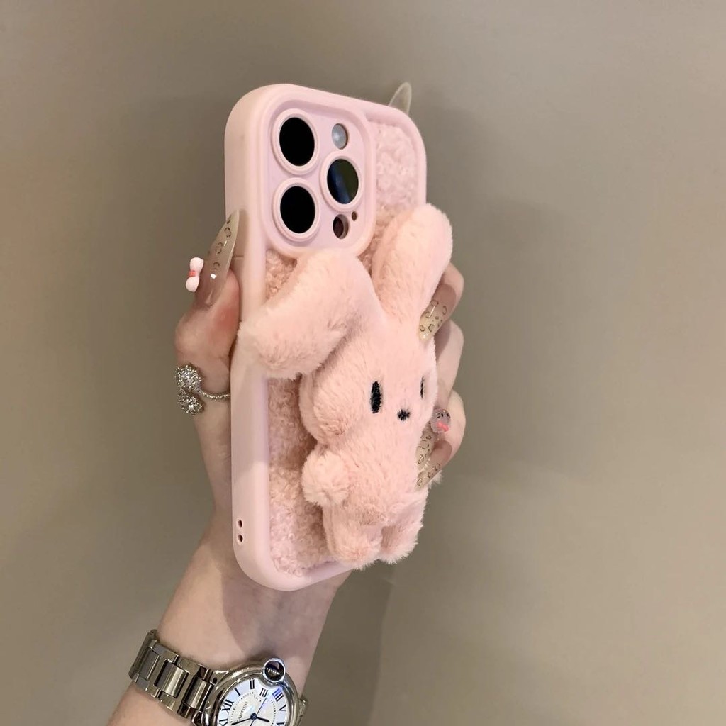 Cute pink three-dimensional folding ear rabbit plush mobile phone case for iPhone16 15 14 13 12 11 Pro Max IXS MAX XR XS 7 8 Plus shockproof camera protection soft back cover