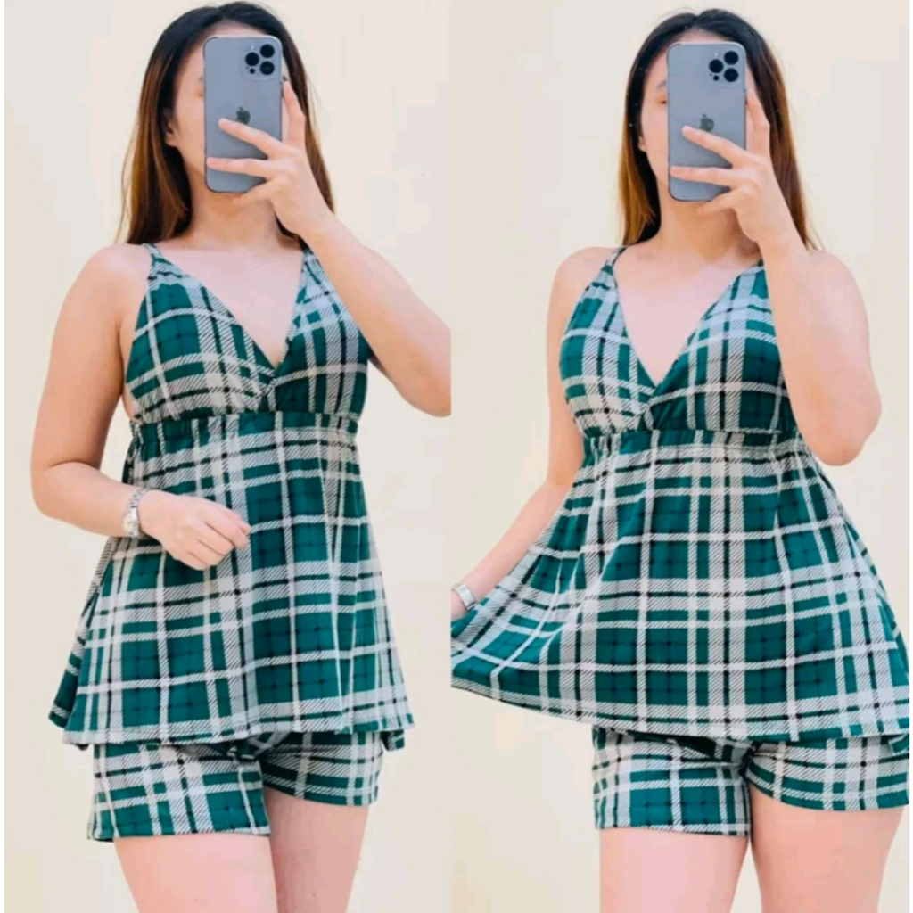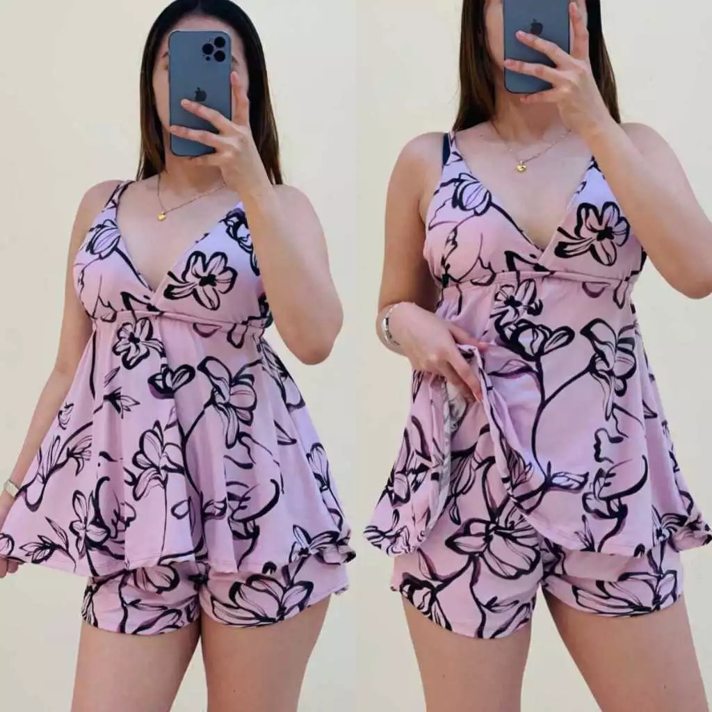 D&C-Cotton Spandex Terno Floral Spaghetti V-Neck With chest pad Top and Shor