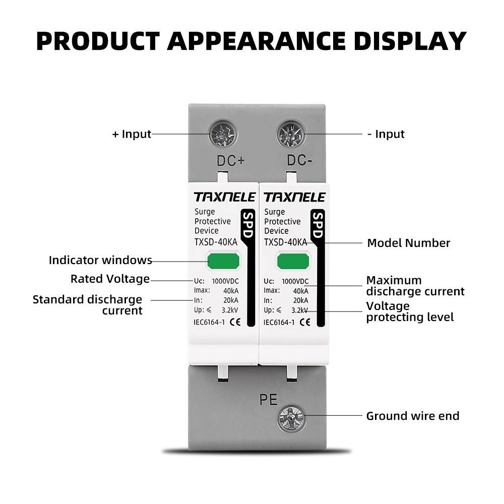 DC SPD Surge Protector 2P 20KA 40KA 60KA Voltage Protector Solar PV Lightning Arrester 600V 1000V