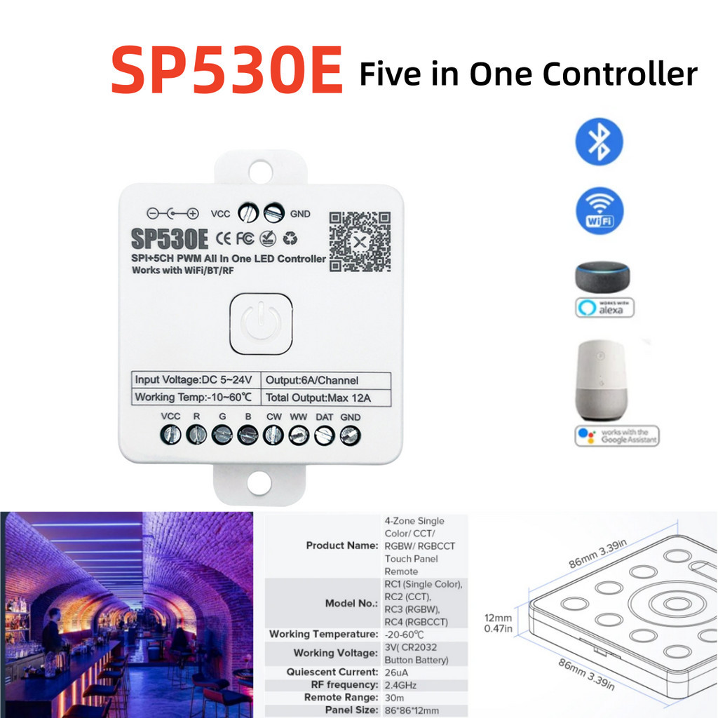DC5V-24V Multi-Function WIFI Controller SP530E 5CH PWM SPI Pixels Controller RB4 Remote RGBCCT 5CH Smartphone APP Voice Control