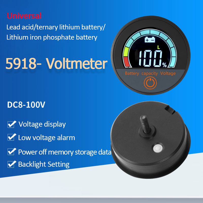 DC8-100V LCD Multifunctional Digital Round Electricity Meter Battery Capacity Indicator Lithium LiFePO4 Lead-acid Cell 12V 24V 48V 72V Voltmeter Low Voltage Alarm Function