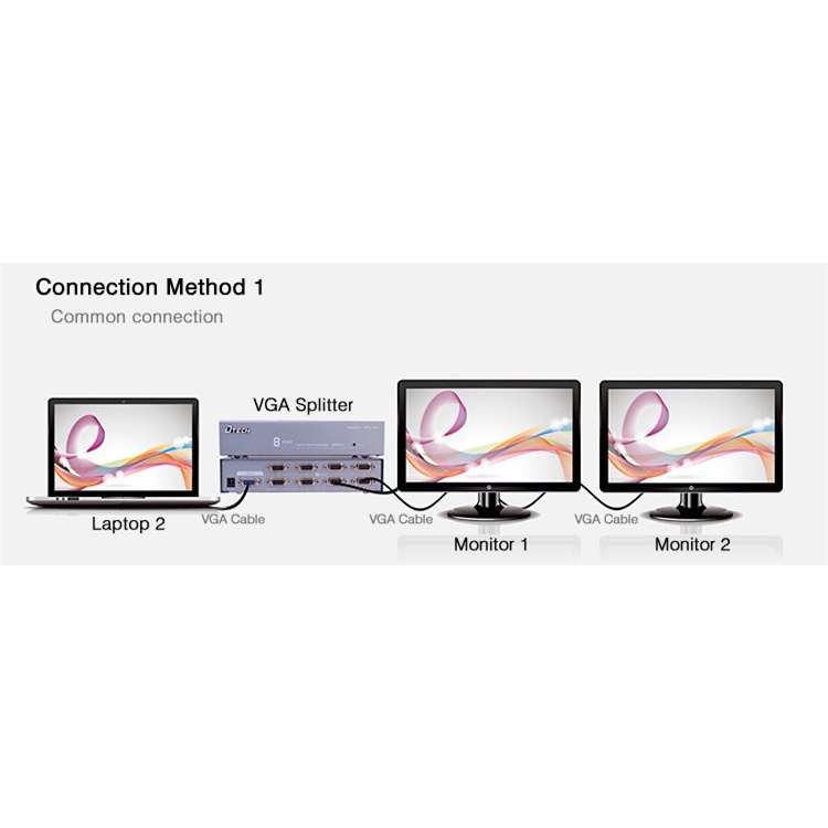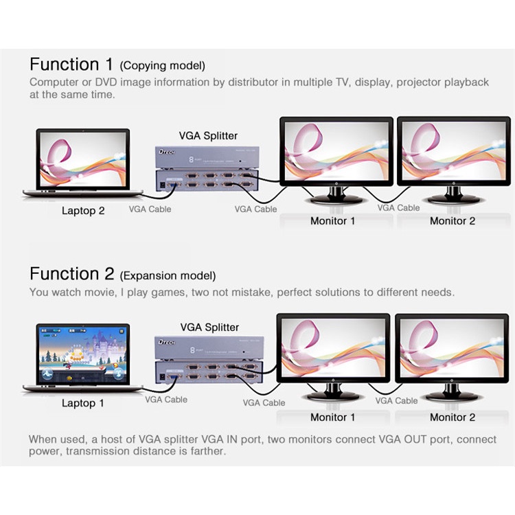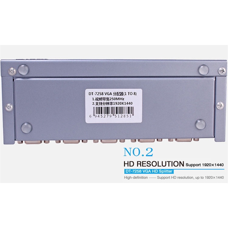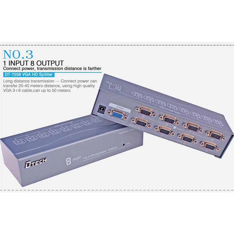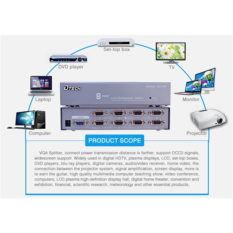 DTECH 8-Port VGA Splitter Box 1 in 8 out Video Distribution Duplicator with Power Adapter High Resolution 1080P For 1 PC to Multiple Monitors
