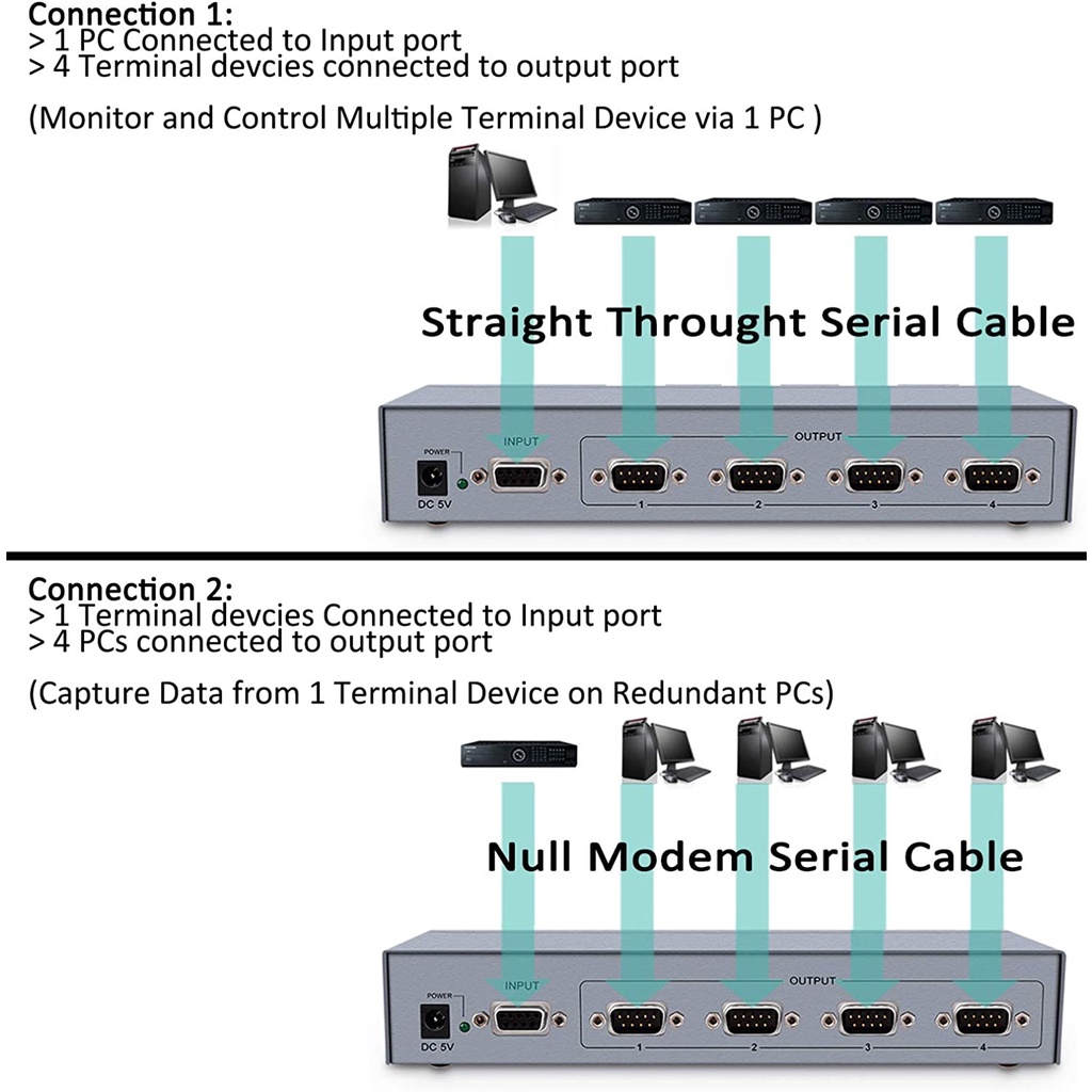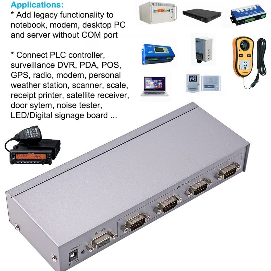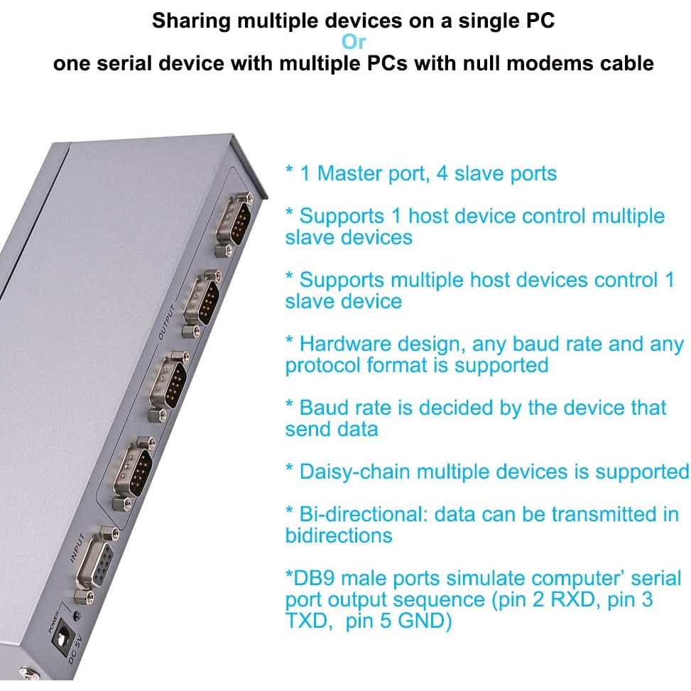 DTECH RS232 Splitter 4 Port Serial Expansion Box 1x4 COM Port Expander with Power Adapter for Sharing PCs and Capture Data