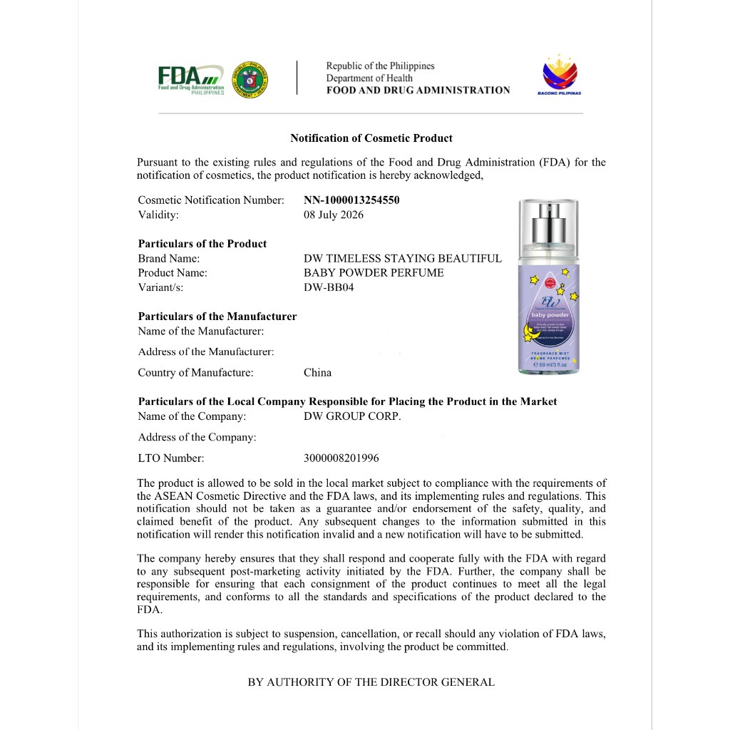 DW Baby Powder perfume long lasting Blossom Milk + Rice Perfume EDP Fragrance 88ml FDA APPROVED