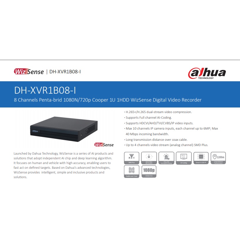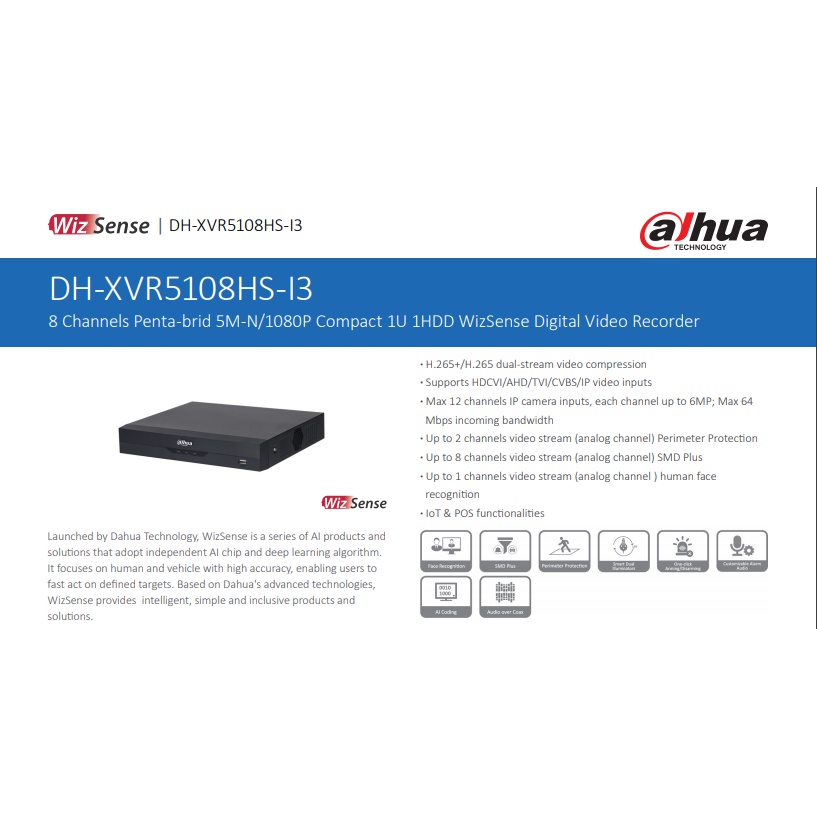 Dahua DVR 2MP/5MP 4CH/8CH/16CH H.265 Face Detection Motion Detect WizSense Recorder For CCTV Camera