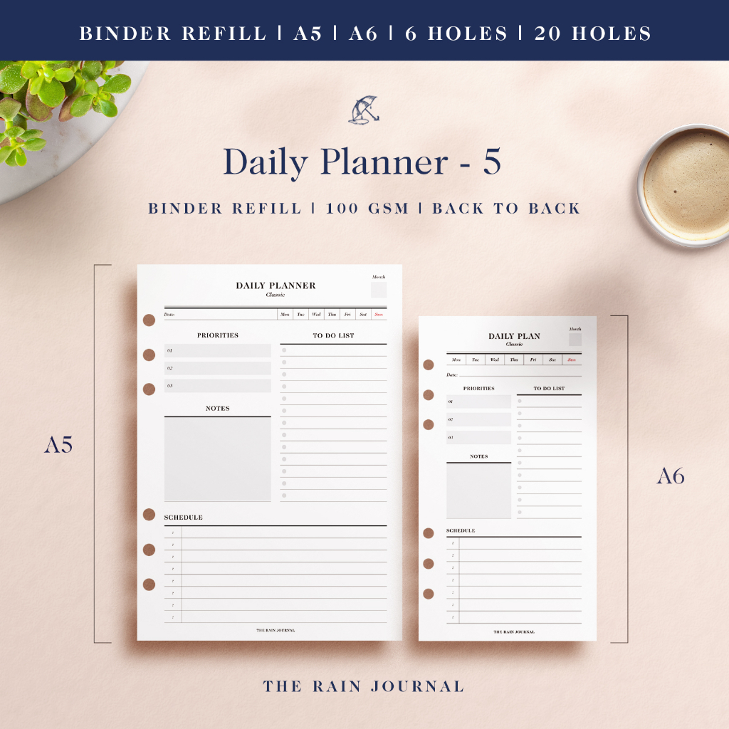 Daily Planner Ring Binder Refill - Daily Agenda, Daily Schedule, A5, A6, Daily To do list, Looseleaf