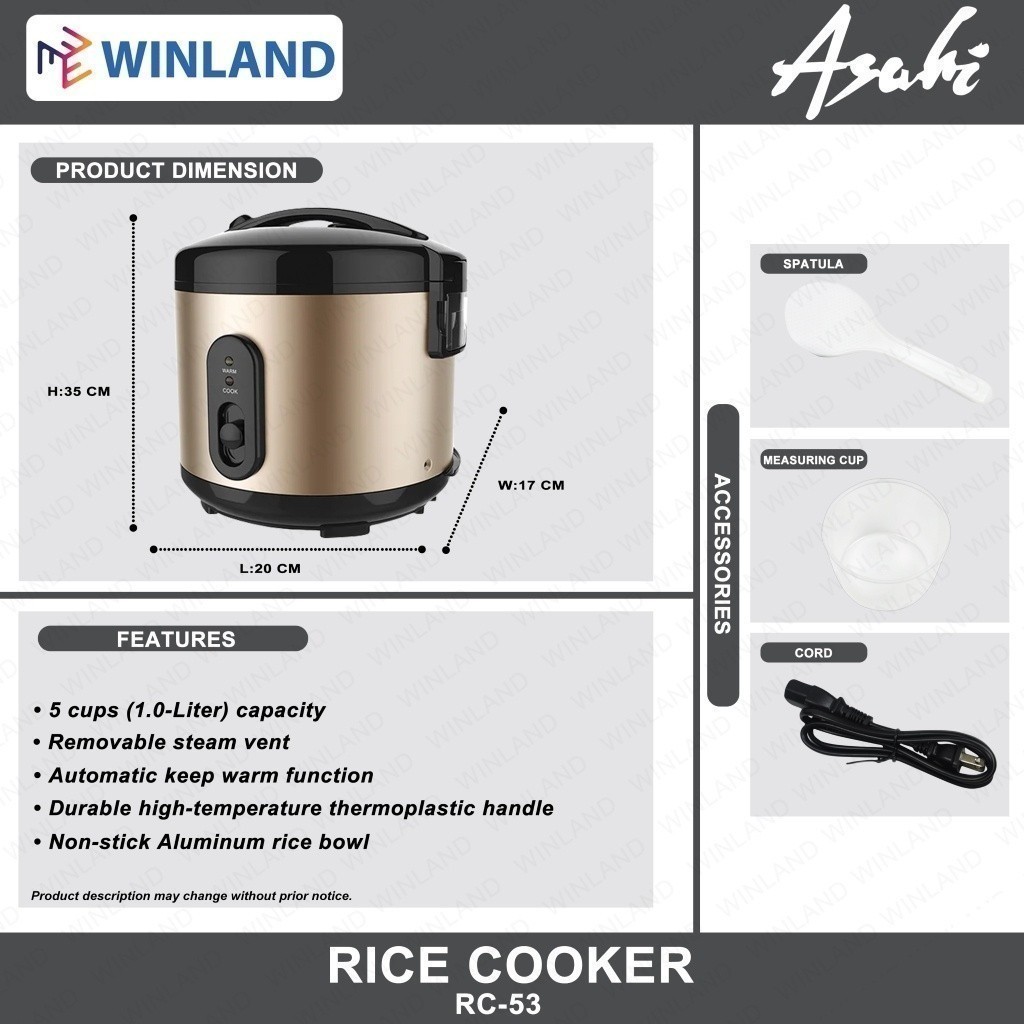 Asahi by Winland 5 Cups Rice Cooker with Aluminum Non-stick Inner Pot RC-53