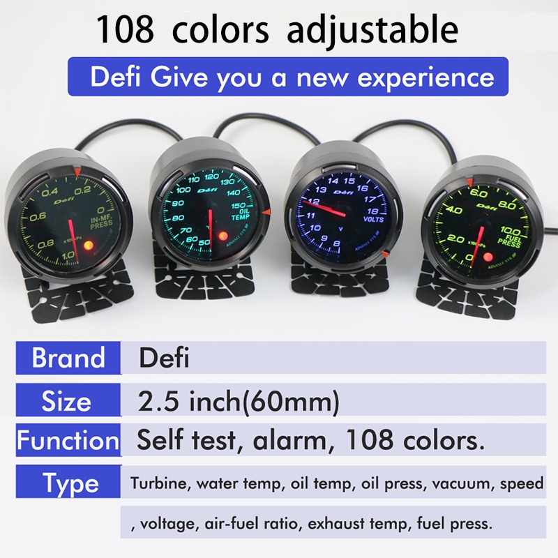 Defi Gauges 2.5inch 108 Colors 60mm Water Temp Oil Temp Turbo Boost Pressure Voltage RPM Speed Voltmeter Vacuum Fuel Press