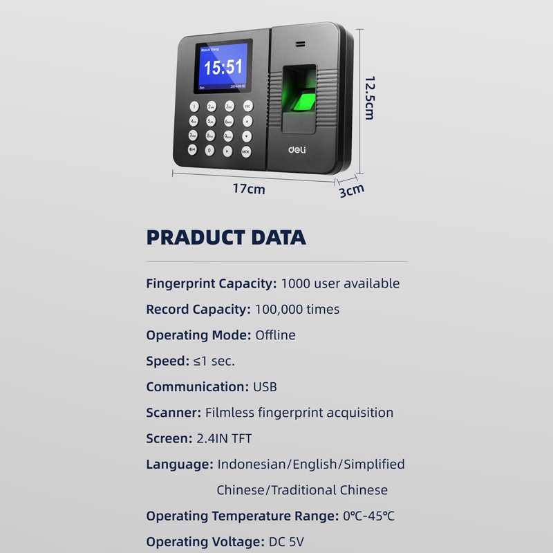 Deli Fingerprint Attendance Machine Fingerprint Recognition 2.4'TFT Screen Biometric Scanner E3960