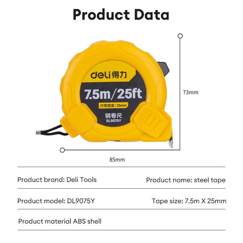 Deli Measuring Tape 2M|3M|5M|7.5|10M Industrial Steel SELF LOCK Measuring Meter Tape Measure