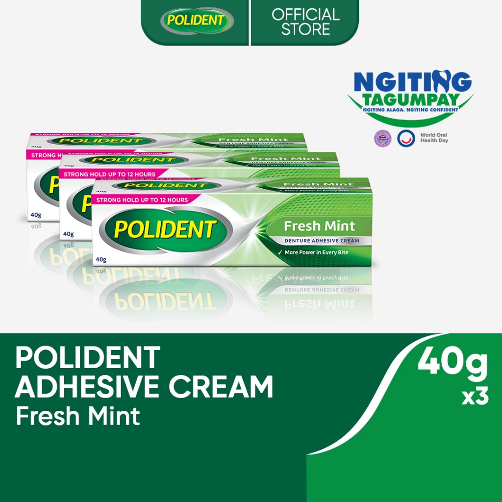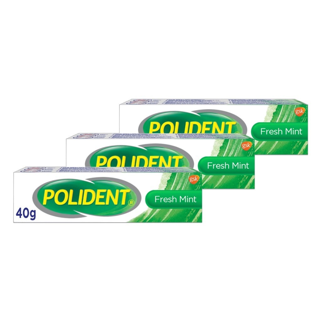 Polident Denture Adhesive Cream Fresh Mint 40g x3 12-hr Strong Kapit, Gum Comfort, Food Blocker