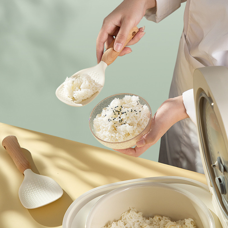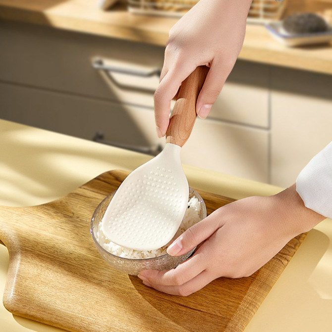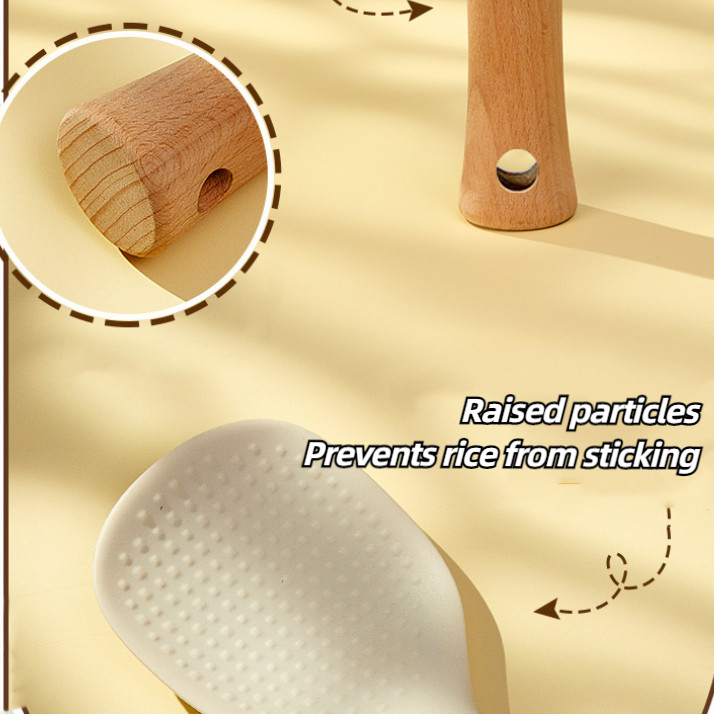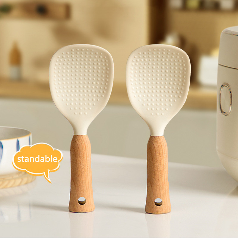 Standable Silicone Non-stick Rice Spoon with Particles Wooden Handle Rice Spatula Household Standing Storage Rice Spoon