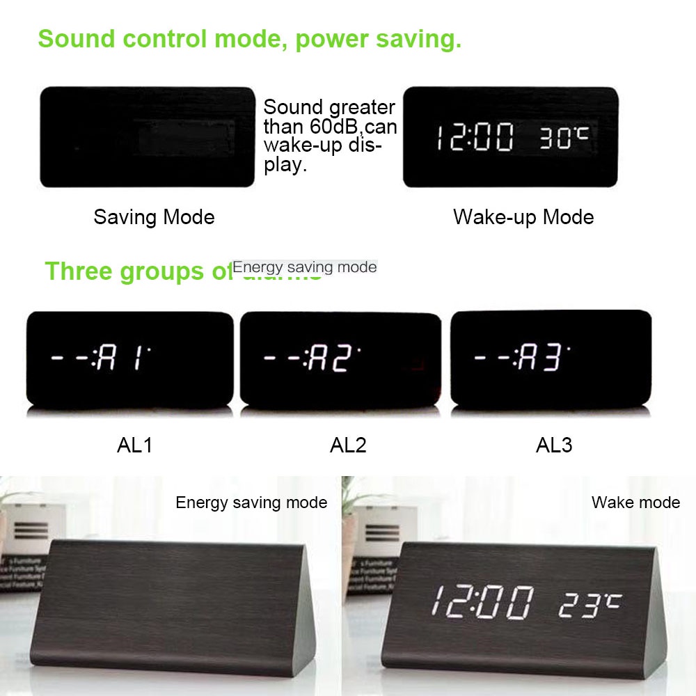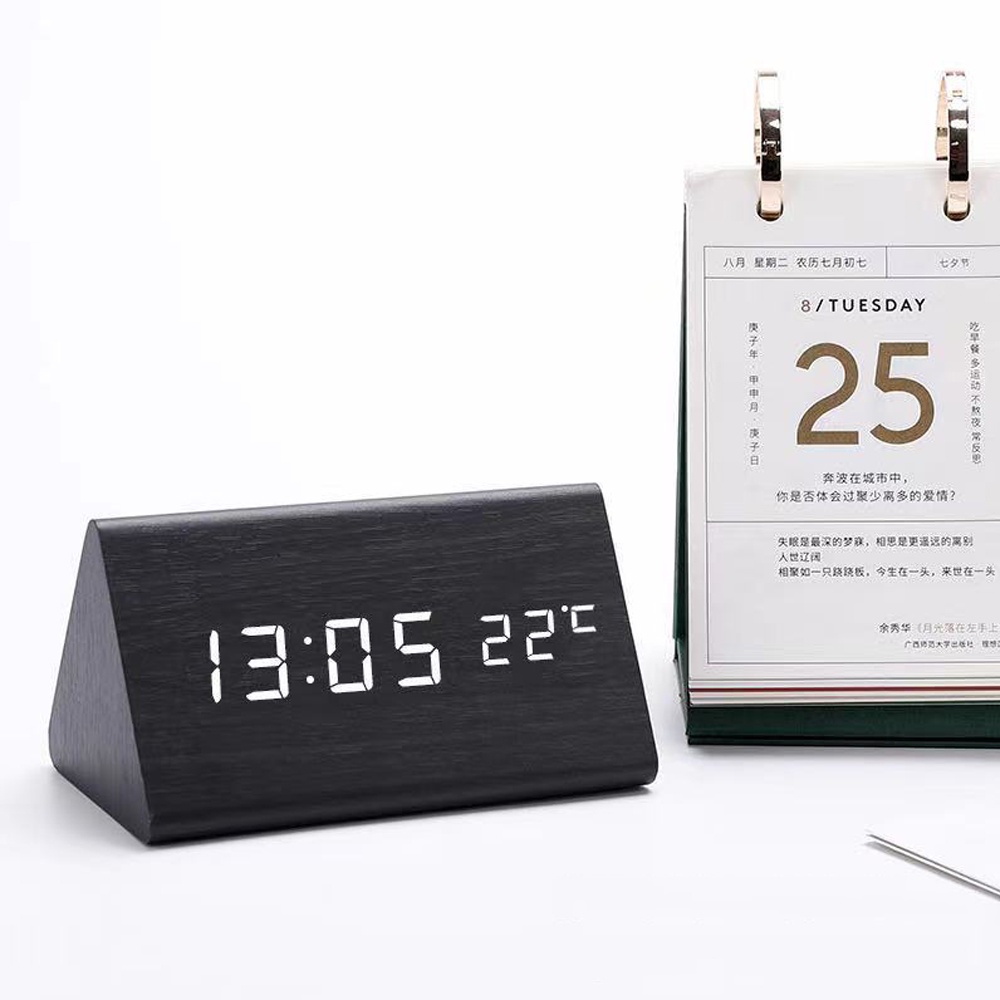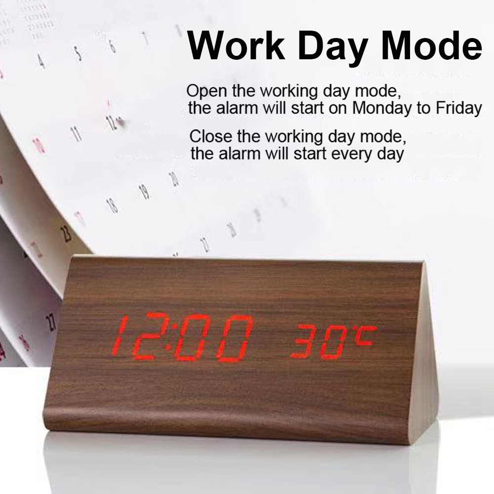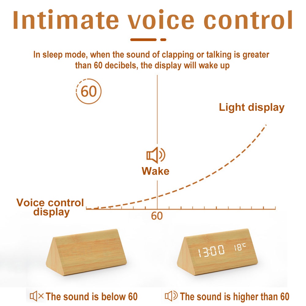 Digital Alarm Clock Desktop Wood LED Clocks Sound Control Electronic Display Thermometer