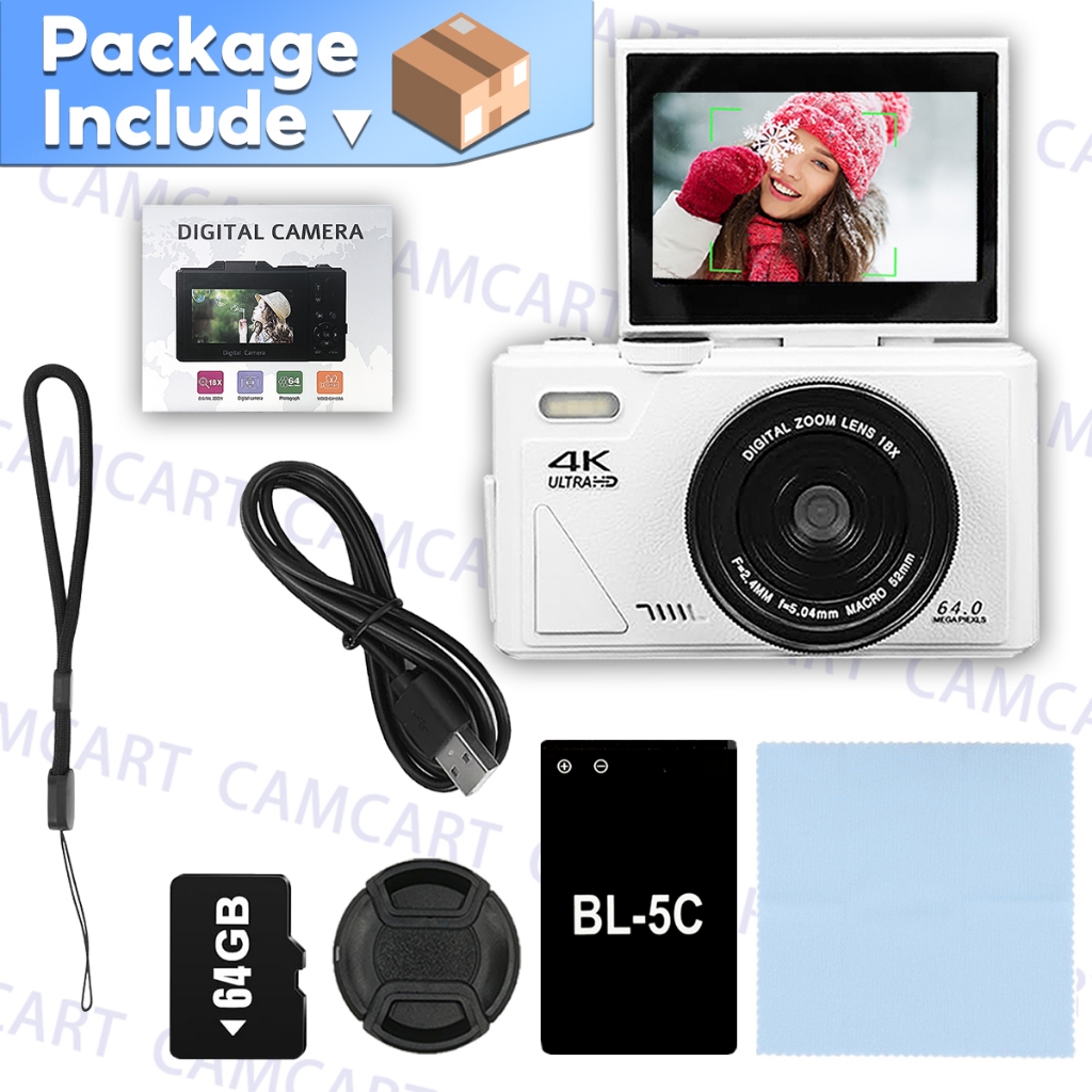 Digital Camera With 64GB SD Card And 3'' Flip Screen For 4K Vlogging And Photography