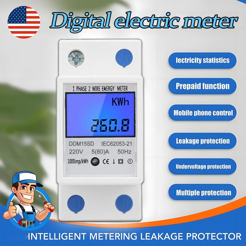 Digital Electric Meter AC Meter DIN Rail KWh Meter Wattmeter 5-80A Tool Backlit Single Phase LCD Digital Display Wattmeter Power Consumption Energy Meter kWh AC 230V50/60Hz