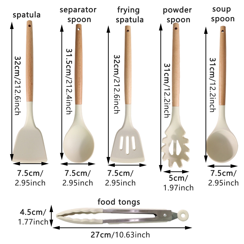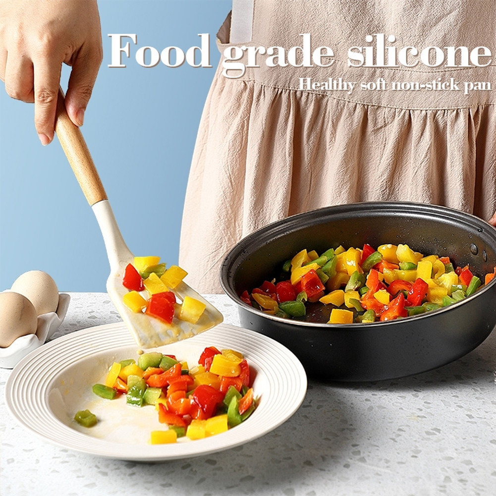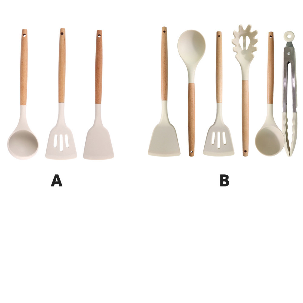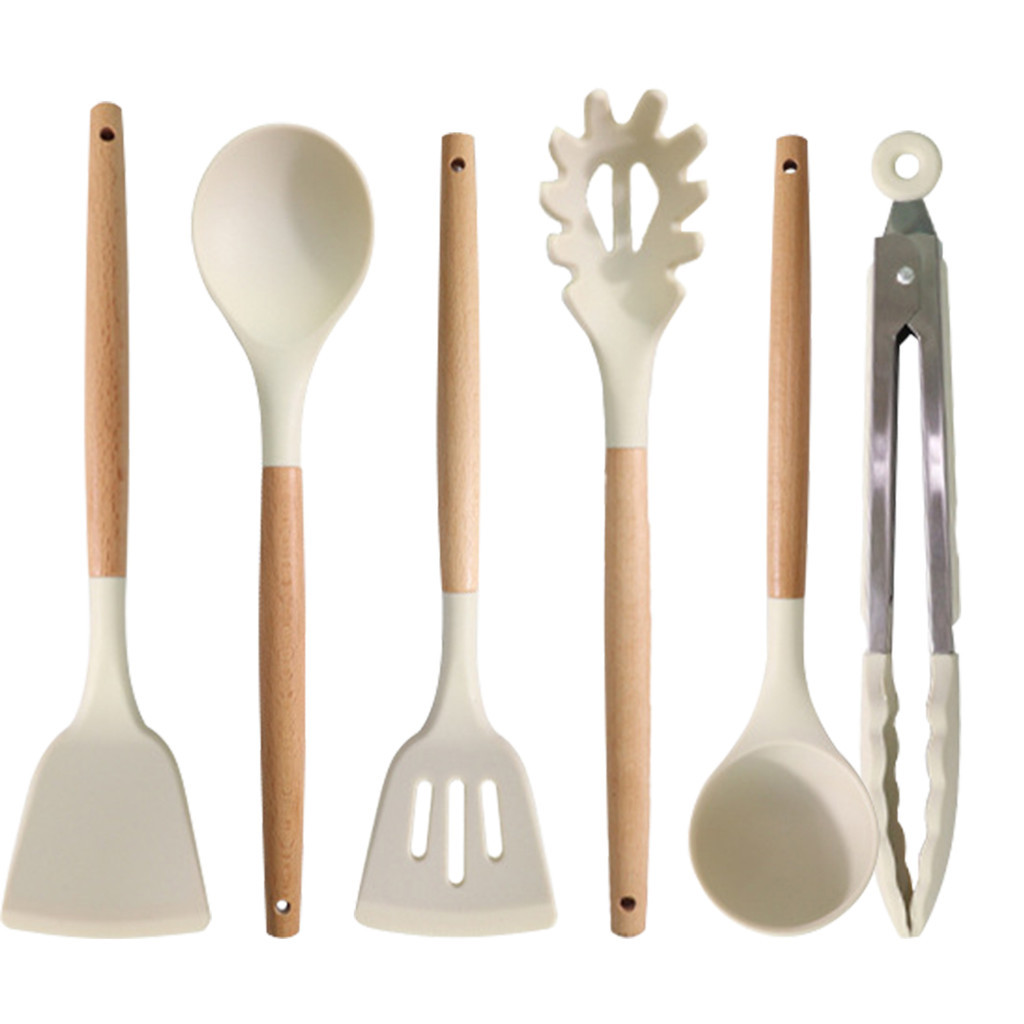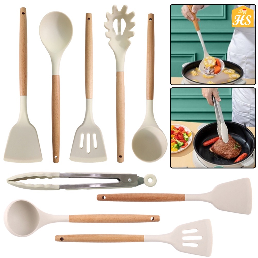 HS White Silicone Kitchenware Cooking Utensils Set Spatula Spoon Wooden Handle Non-Stick Spatula Cooking