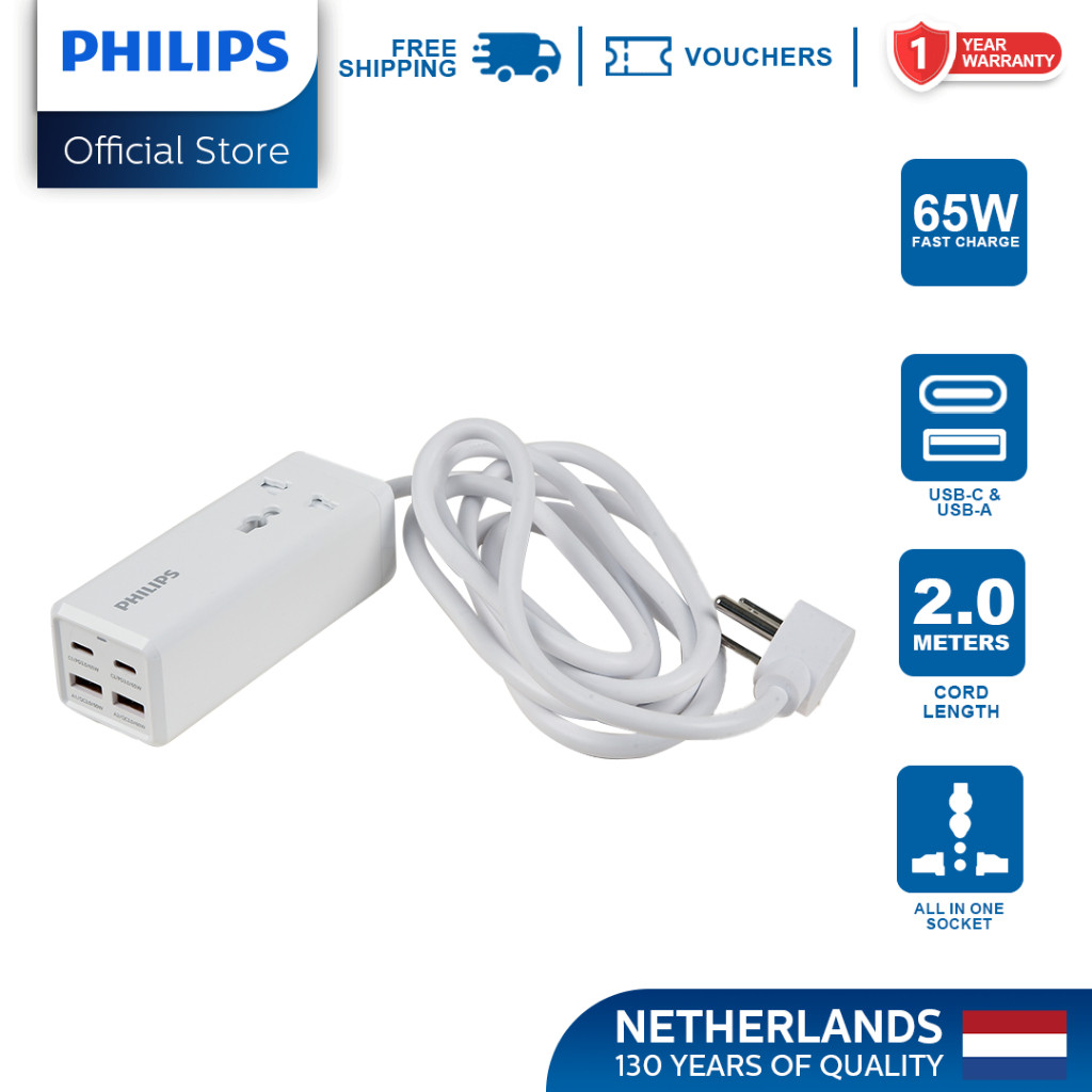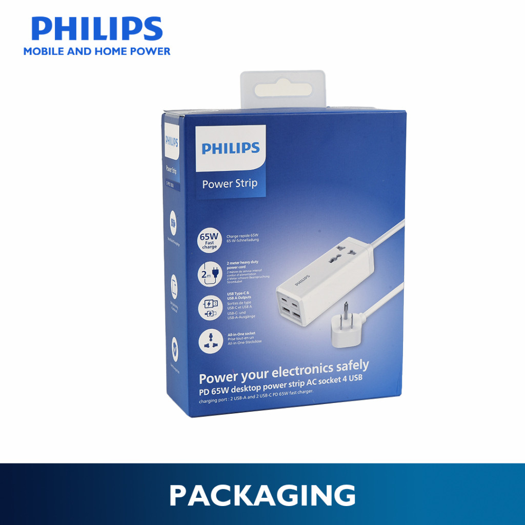 Philips PD 65W 2Meter with 2 USB-C and 2USB-A Universal Heavy Duty Extension Power Strips Socket