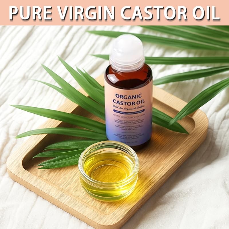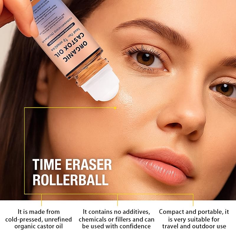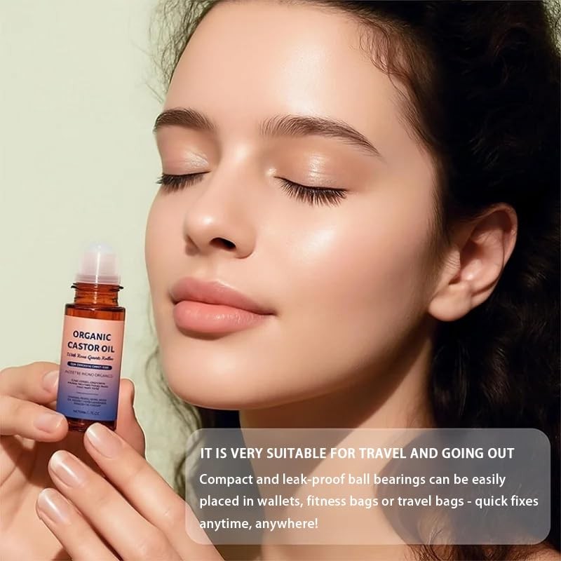 Organic Castor Oil Roll-On with Rose Quartz, 100% Pure Cold-Pressed & Unrefined, Hexane-Free, For skin, Eyebrows and Eyelashes, 50mL