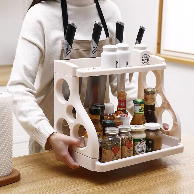 Double Layer Kitchen Shelf Seasoning Floor Plastic Knives Rack Condiment and Dishes Rack