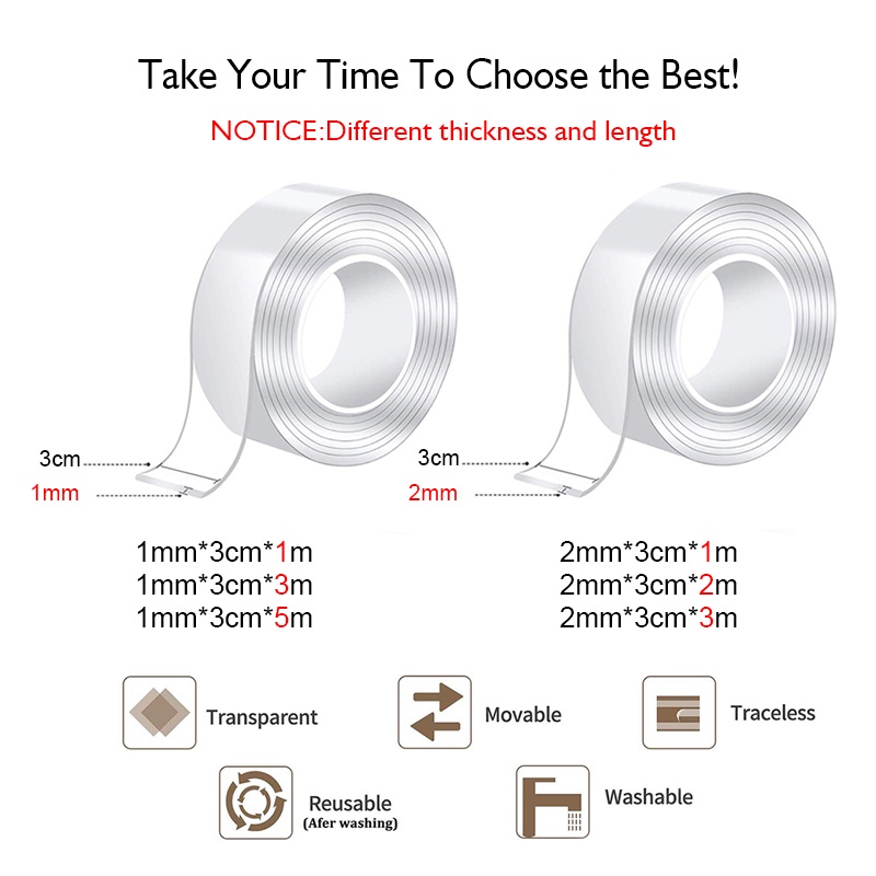 Double-Sided Tape Nano Tape Non-Marking Strong Tape Transparent Removable Tapes 1mm/2mm*3cm