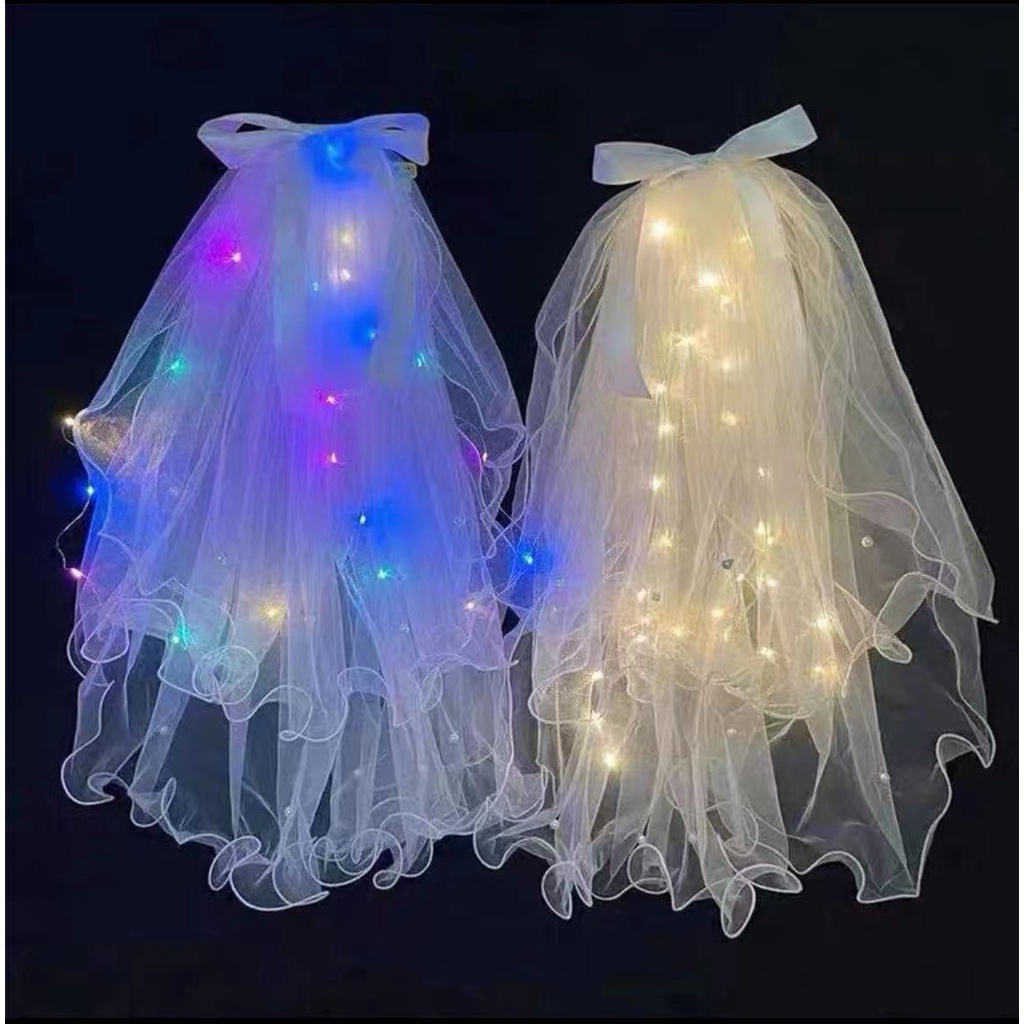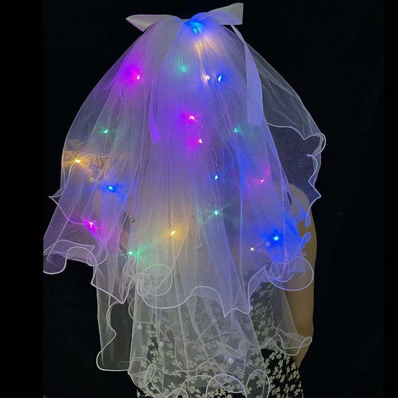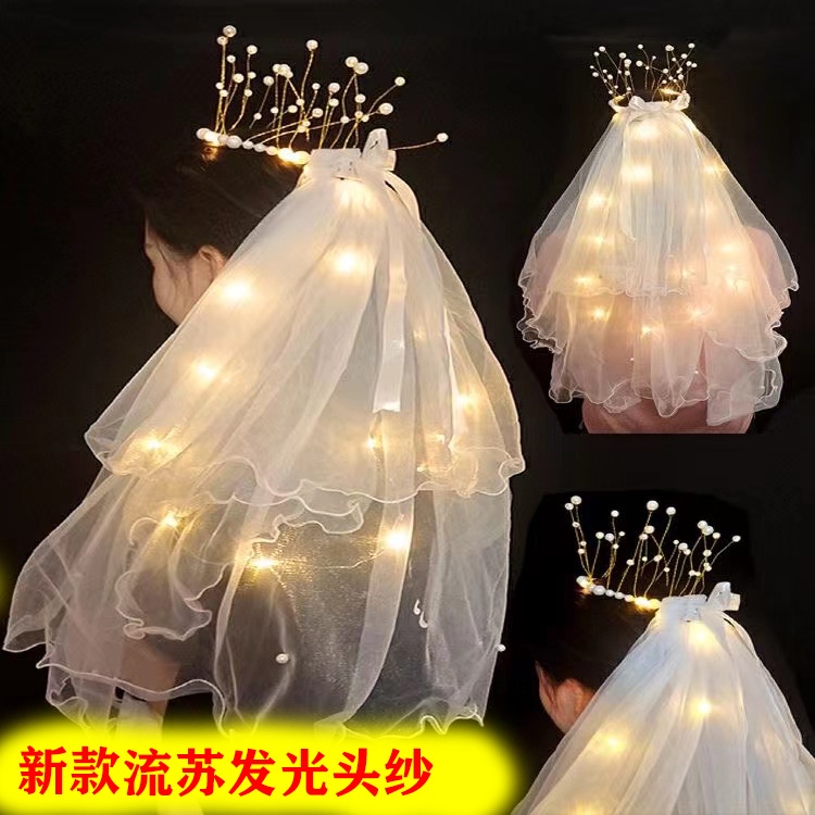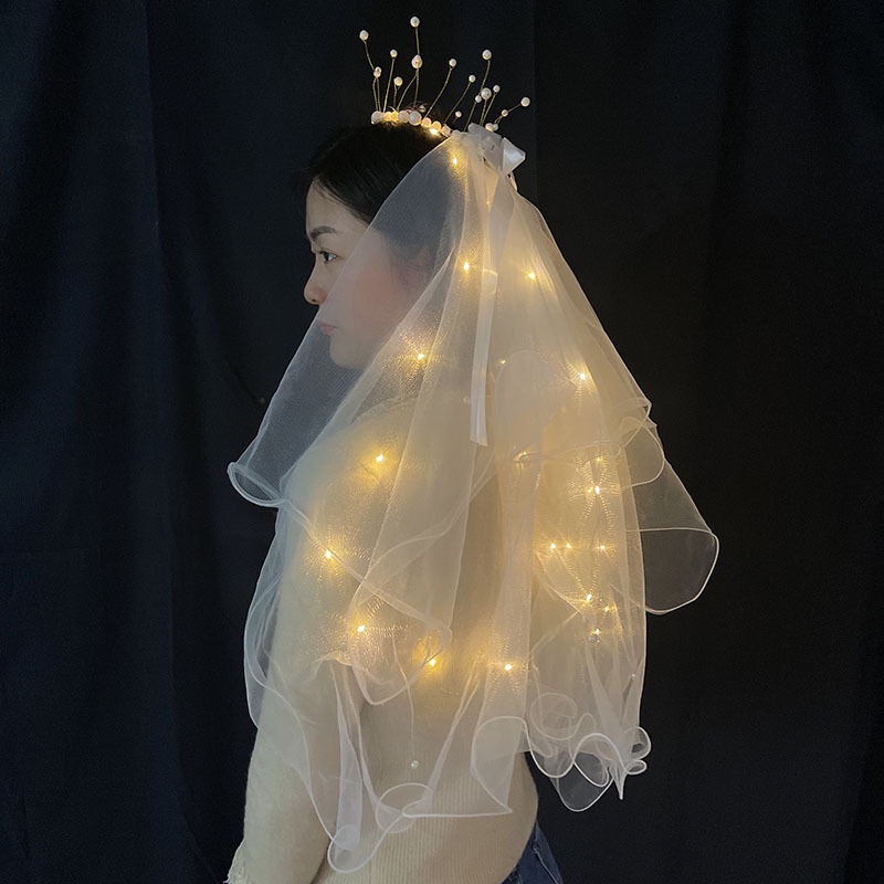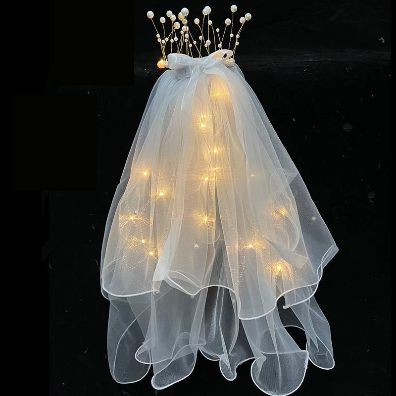 Double-layer LED Lighting Veil Crown Bowknot Pearl Lighted Birthday Bride Flowers Girls Wedding Veil Kids Headpieces Hairpin Beautiful Light-emitting Veils