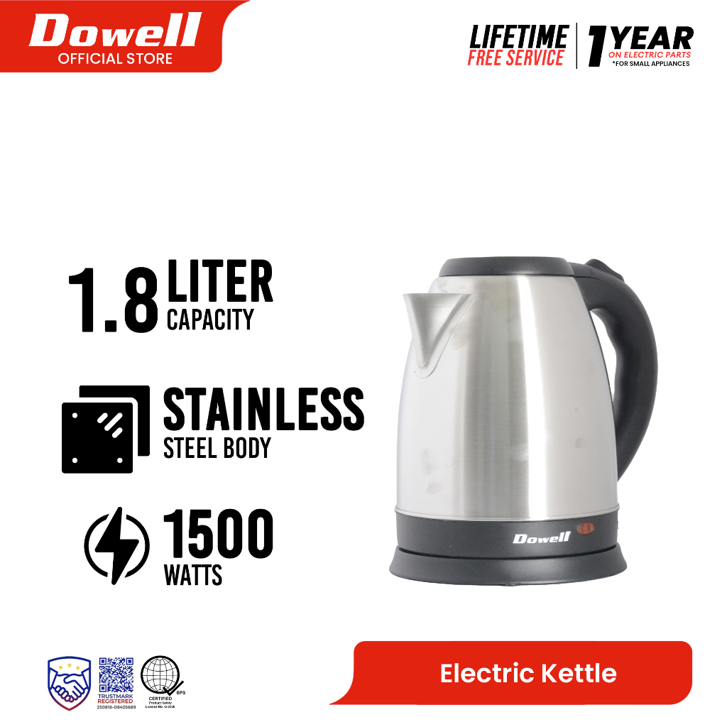 Dowell 1.8L Stainless Electric Kettle with Cool Touch Plastic Handle | EK-182S