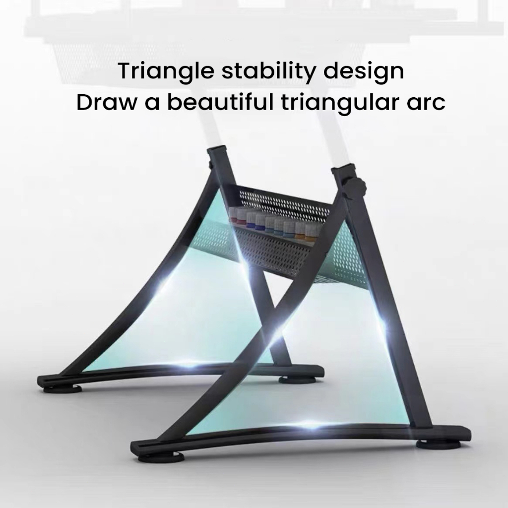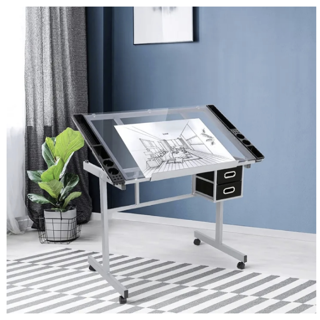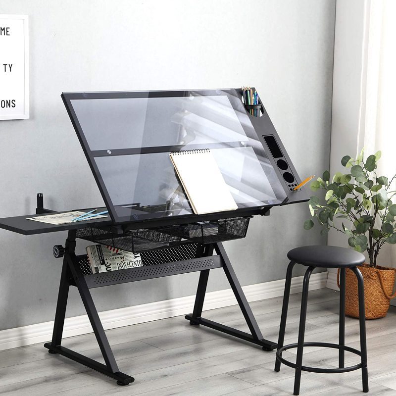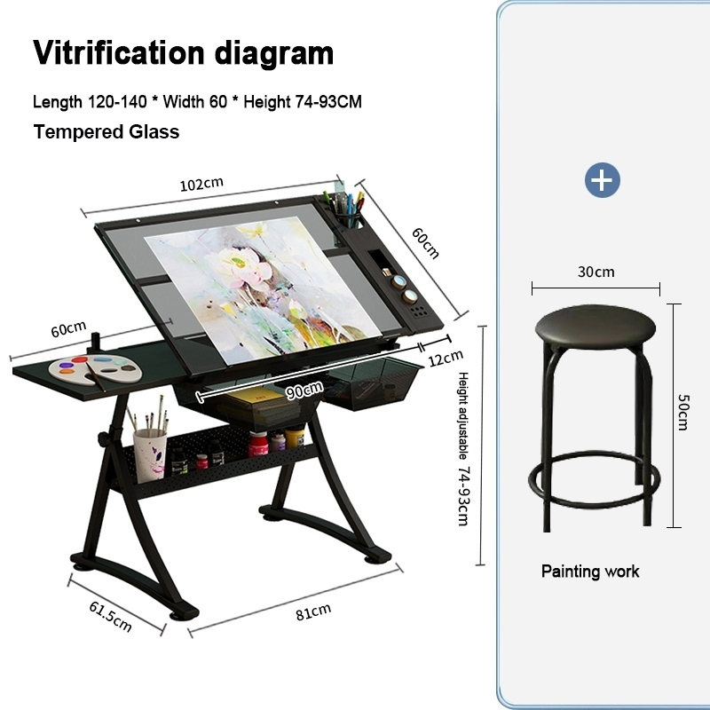 Drafting Glass Table Height Adjustable Drawing Table with Stool Pen Holder and Extra Table