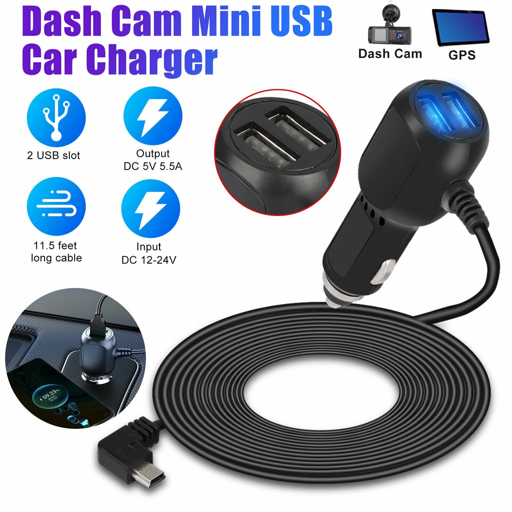 Driving recorder car charger mini USB cable 5v power cord wire suitable for DVR camera GPS w/2usb