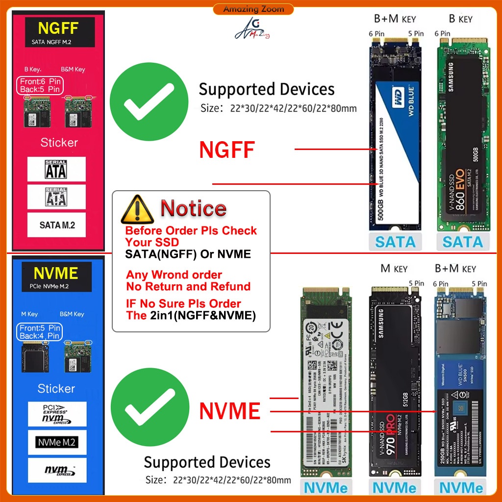 Dual Protocol USB 3.1 to M.2 NGFF/NVME 2in1 SSD Hard Disk Box Adapter Card HDD Enclosure Case