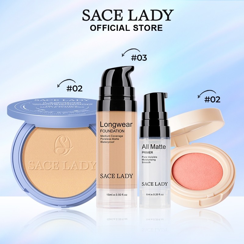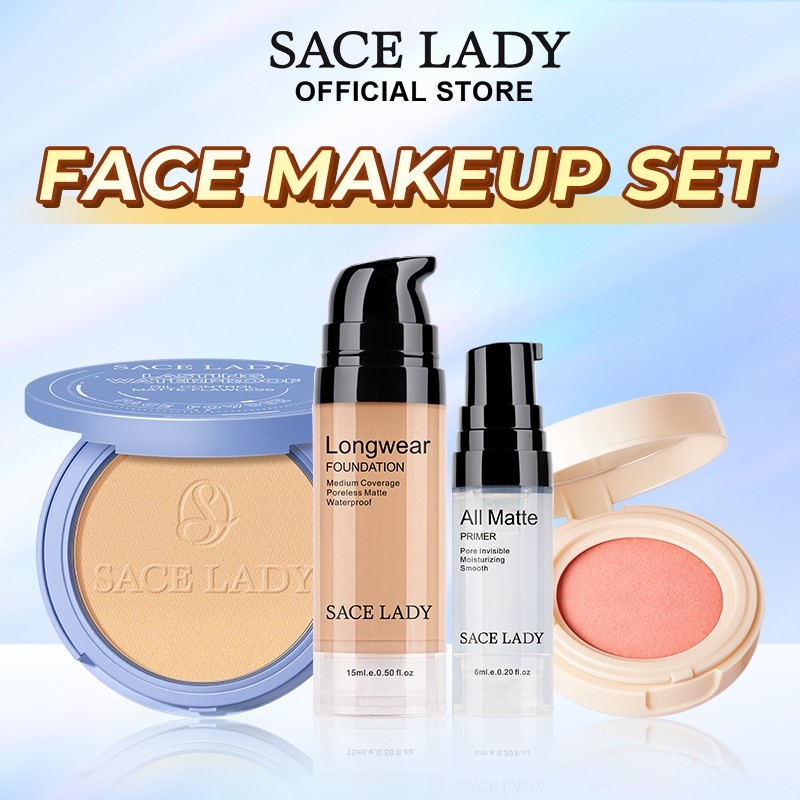 SACE LADY 4PCS Face Makeup Set Primer Face Powder Liquid Foundation Natural Blush LongLasting Makeu