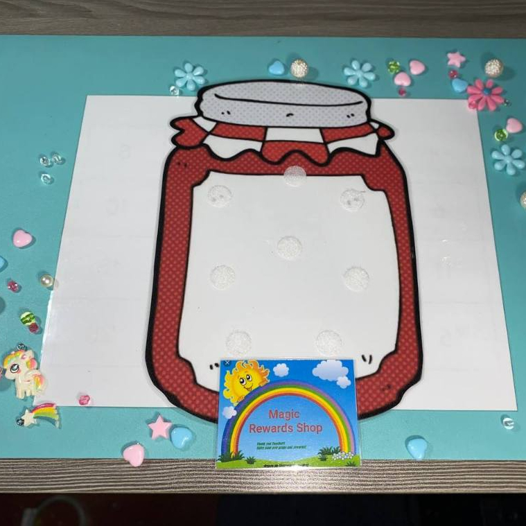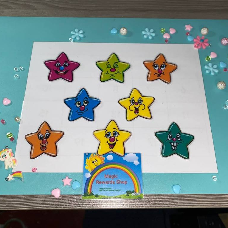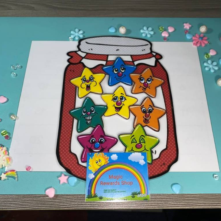 ESL REWARDS SET - 8 COLORFUL STARS W JAR BACKGROUND LAMINATED REWARDS (MAGNETIC/VELCRO)