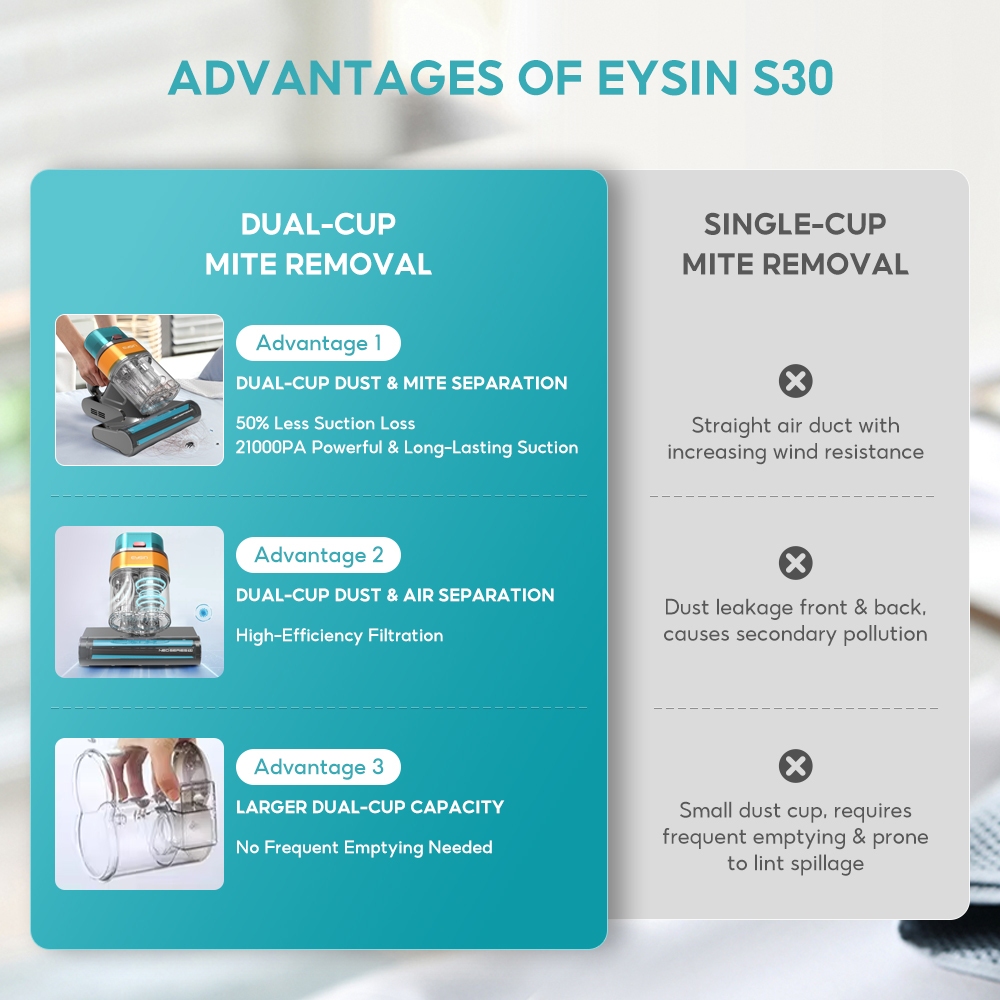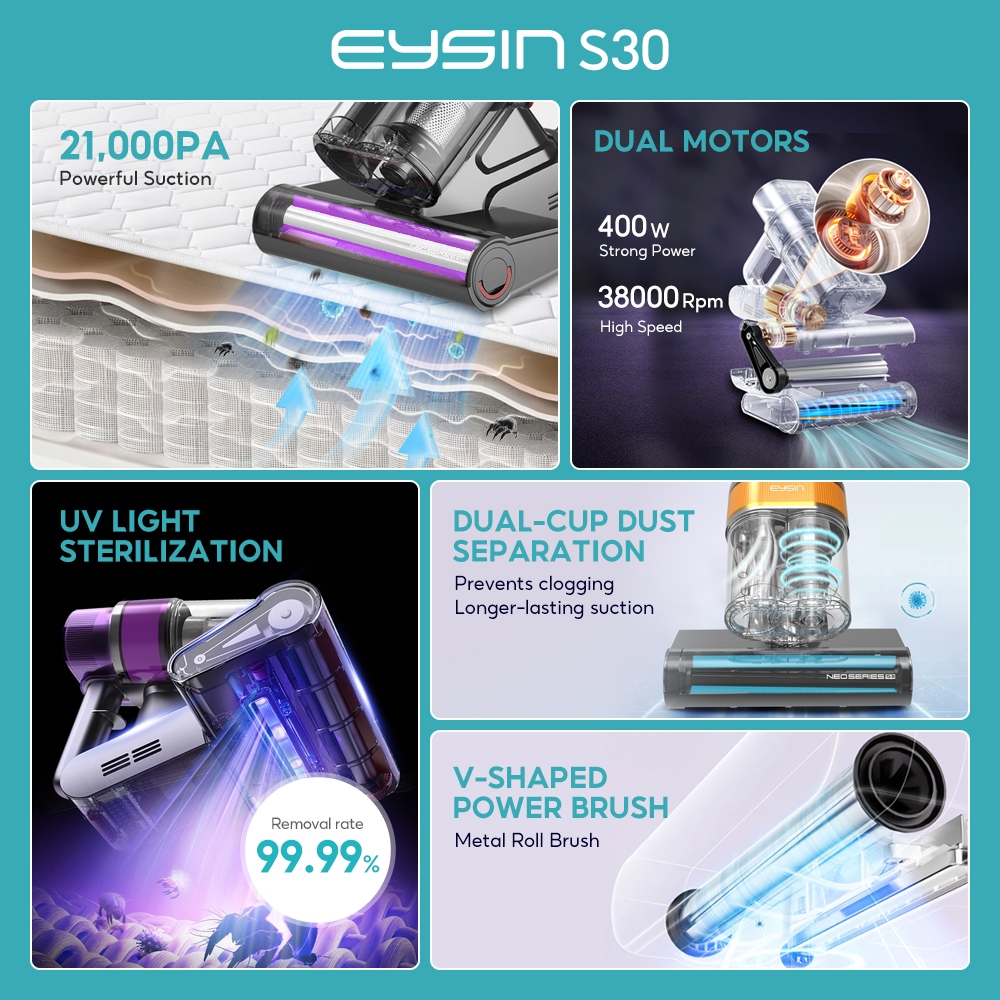EYSIN S30 Dust Mite Vacuum Cleaner for Home Dual Cup Strong Suction with UV Household