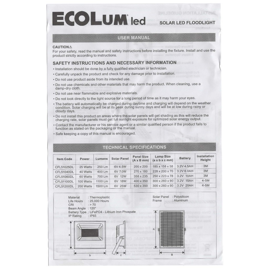 Ecolum by Winland Solar LED Floodlight 200W / 1500 Lumens Daylight CFL51200DL