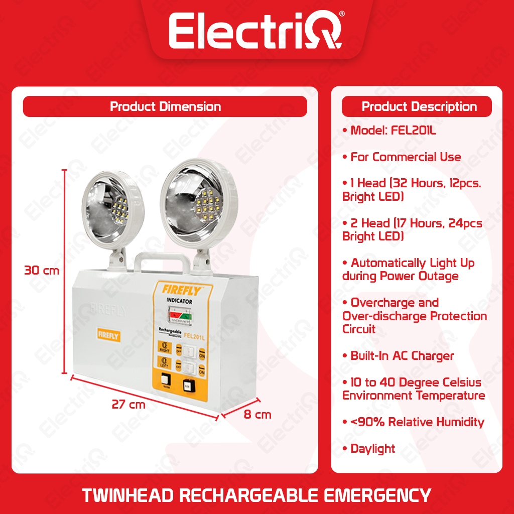 Electriq l Firefly Quick Response Twinhead Rechargeable Emergency Lamp Light FEL201L
